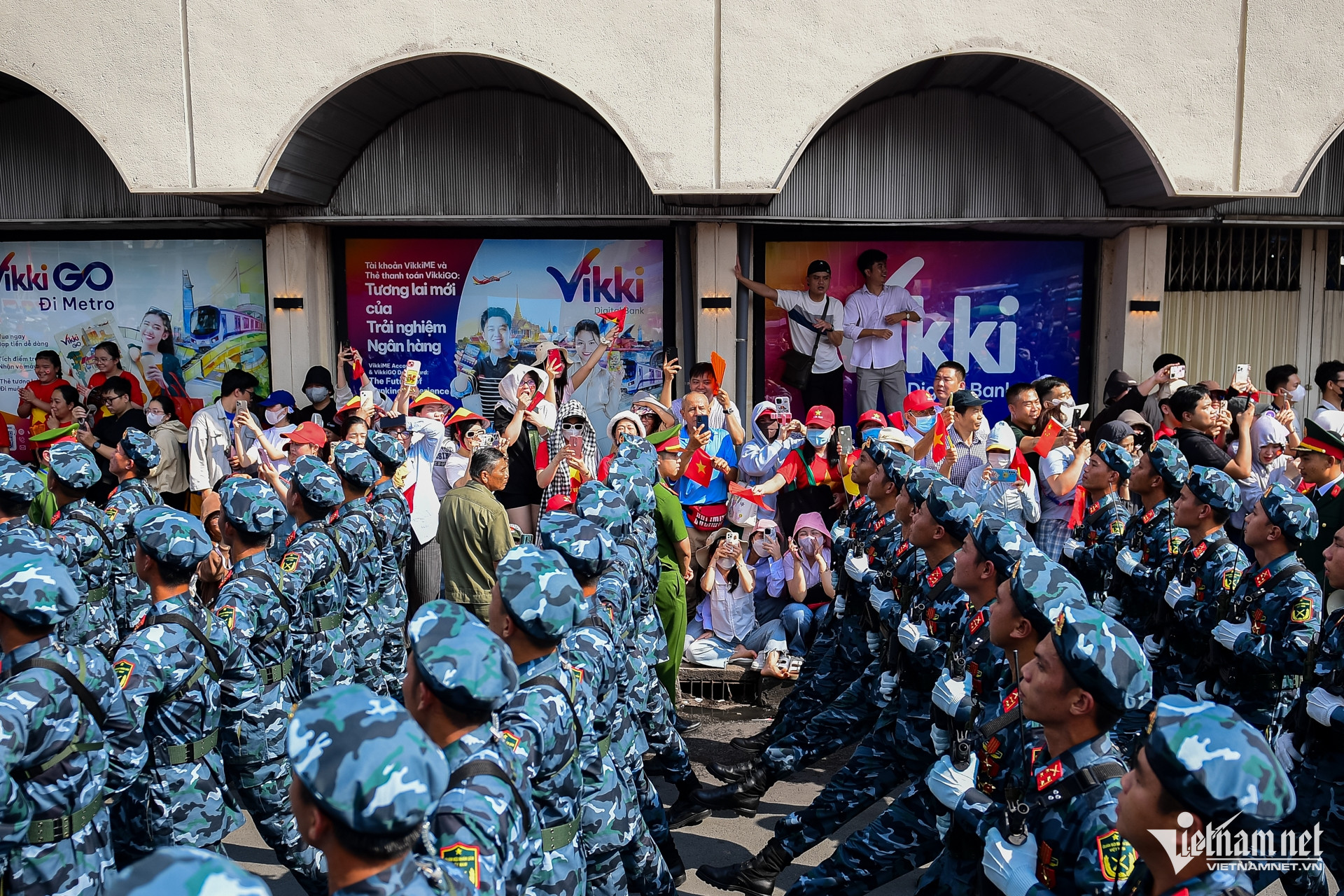 Các chiến sĩ uy nghi, bước đi đều tăm tắp giữa hàng dài cờ hoa rực rỡ.