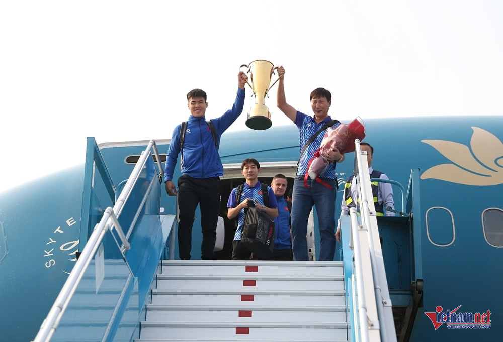 HLV Kim Sang Sik và đội trưởng Duy Mạnh nâng cao cúp vô địch khi bước ra từ máy bay. Ảnh: Song Ngư