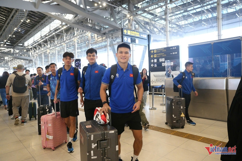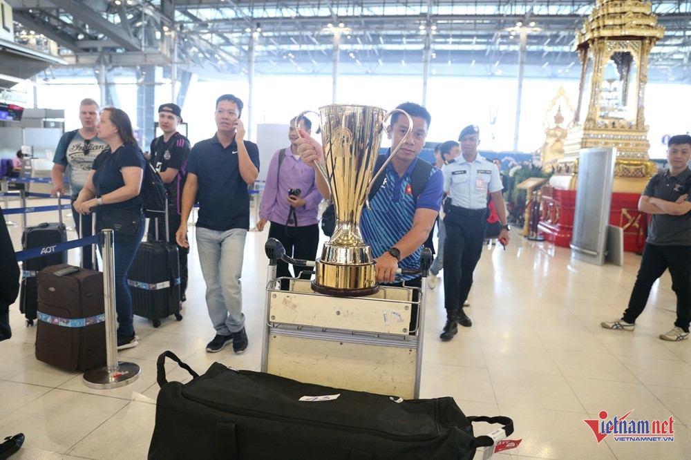 Các thành viên của ĐT Việt Nam có mặt tại sân bay quốc tế Suvarnabhumi, Bangkok làm thủ tục check-in. Toàn đội ai cũng hồ hởi trước giờ lên máy bay về Việt Nam.