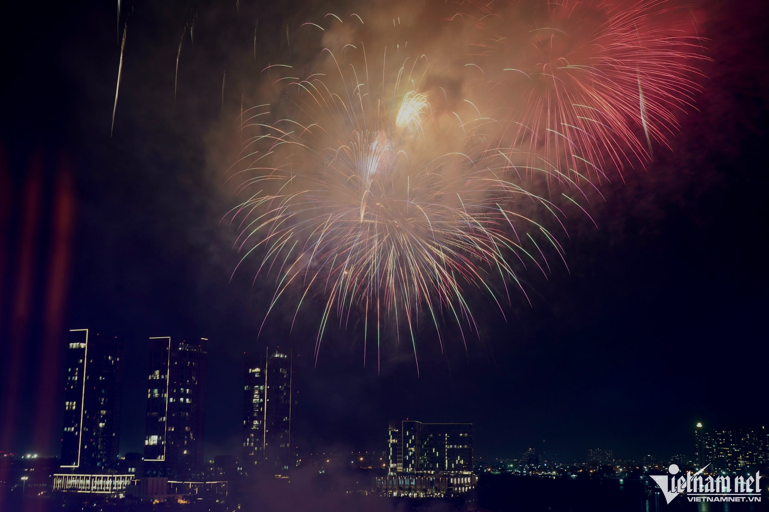 Cùng thời điểm 0h ngày 1 Tết, những loạt pháo hoa bắn lên trên bầu trời TP.HCM.