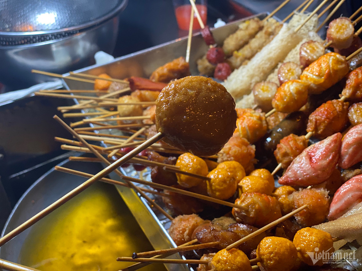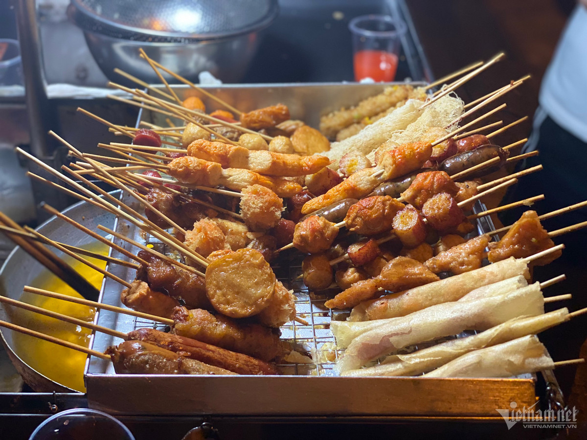 Món đồ bà bán chủ yếu là xiên thịt, tôm, xúc xích, nem, đậu phụ phô mai, khoai tây… và nhiều món đồ ưa chuộng của người trẻ.