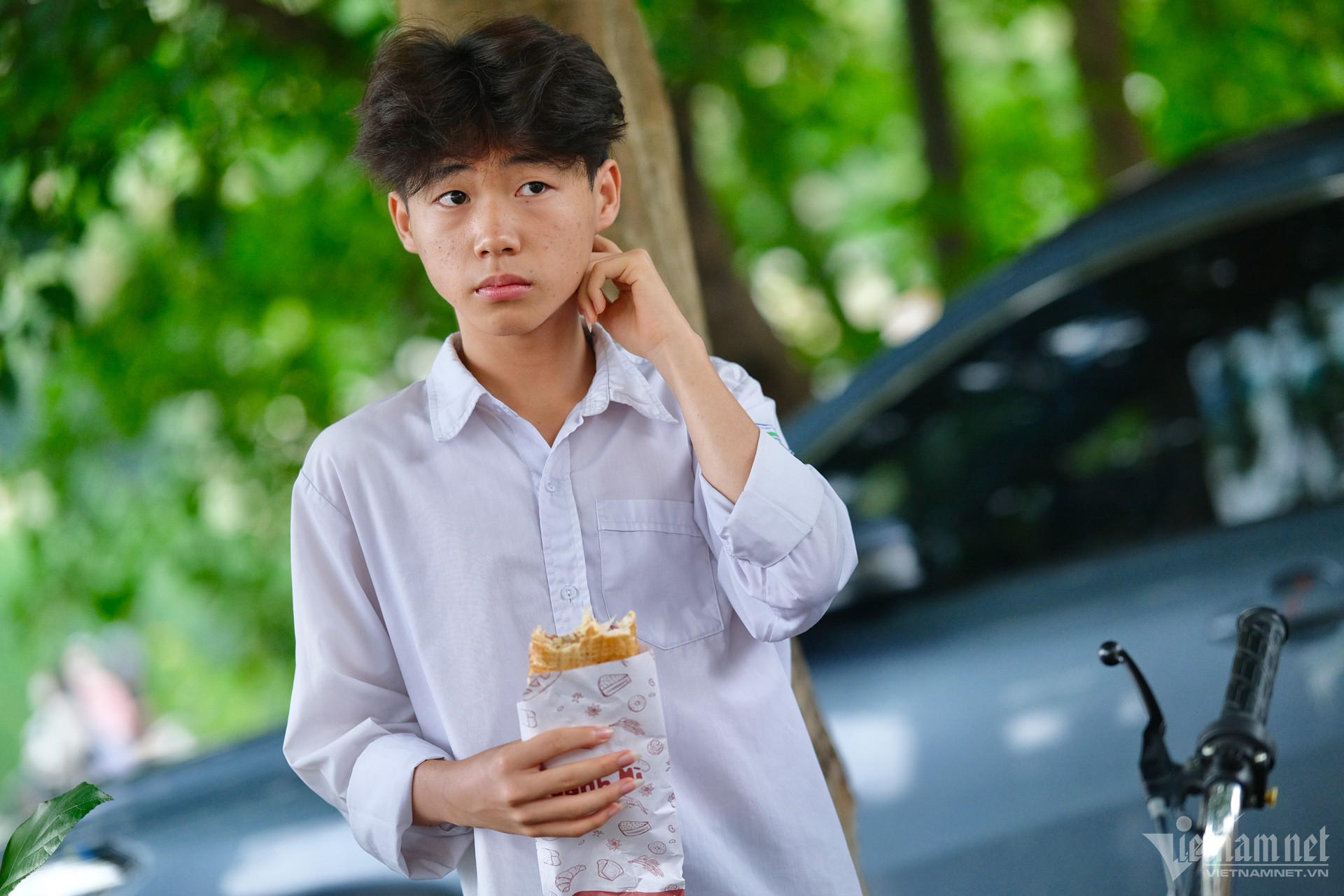 Một số học sinh vội ăn sáng hoặc tranh thủ đọc lại bài trước khi vào phòng thi nghe quy chế.