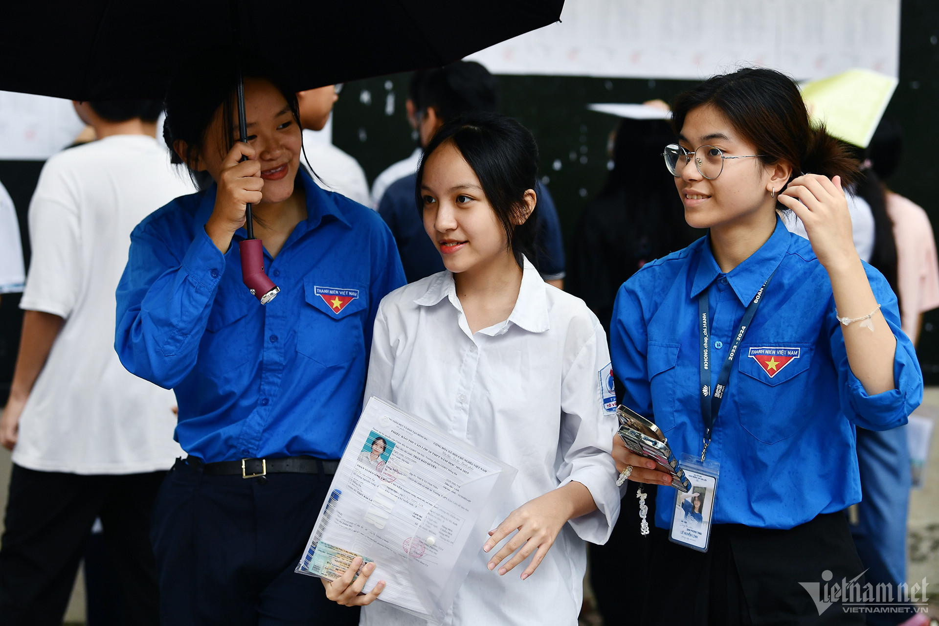 Thí sinh Thảo Quyên (THCS Tô Vĩnh Diện) được thanh niên tình nguyện che ô dẫn vào trong trường. Em cho biết, sức học mình phù hợp nên cảm thấy phù hợp, đã chọn Trường THPT Kim Liên làm nguyện vọng 1.