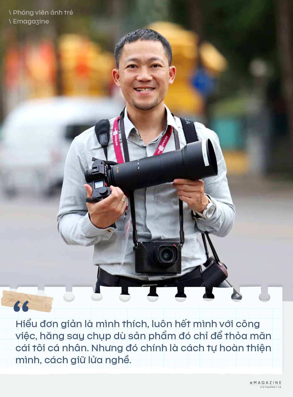 “Với sự thay đổi của báo chí hiện đại, báo chí đa nền tảng tôi nghĩ phóng viên ảnh cần hoàn thiện mình hơn nữa để không bị tụt lại với xu hướng hiện nay”, anh tâm sự.
