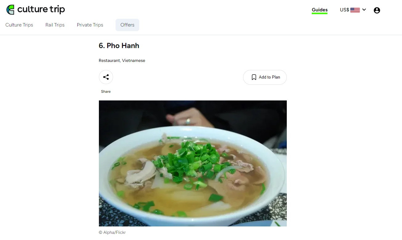 Phở Hạnh: Đại diện duy nhất của phở gà trong danh sách này là phở Hạnh, nằm trên phố Lãn Ông, Hà Nội, chỉ bán vào khung giờ buổi tối. Phở Hạnh được tờ The Culture Trip (một chuyên trang du lịch uy tín) gợi ý là địa chỉ thích hợp để du khách có một bữa ăn nhanh trước khi khám phá Hà Nội về đêm.