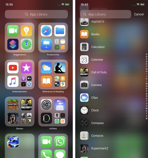 Tính năng App Library trên iOS 14 tương tự như tính năng App Drawer trên Android, cho phép hiển thị toàn bộ danh sách các ứng dụng đã cài đặt trên thiết bị. Tuy nhiên, khác với App Drawer trên Android khi hiển thị danh sách toàn bộ các ứng dụng trên smartphone, App Library sẽ tự động gộp các ứng dụng có chức năng tương tự với nhau để tạo thành từng nhóm thư mục, chẳng hạn nhóm các ứng dụng mạng xã hội, nhóm các ứng dụng nhắn tin, hay các ứng dụng giải trí…