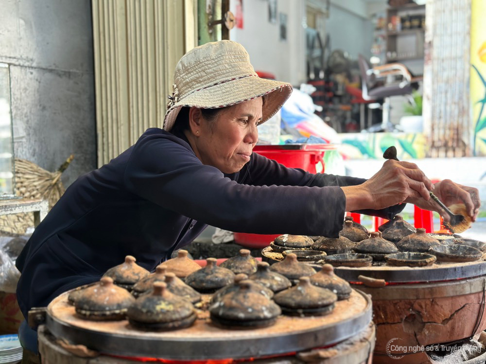 Điểm đến hấp dẫn trên con dốc này chính là quán bánh căn nóng hổi, nơi vợ tôi từng ăn hồi nhỏ, và tôi cũng đặc biệt thích món này khi chấm cùng mắm nêm, thêm vài viên xíu mại. Tấm ảnh chụp bà chủ quán camera bắt nét tốt trong điều kiện chênh sáng. Các đường nét trên gương mặt người phụ nữ được khắc hoạ đầy đủ.