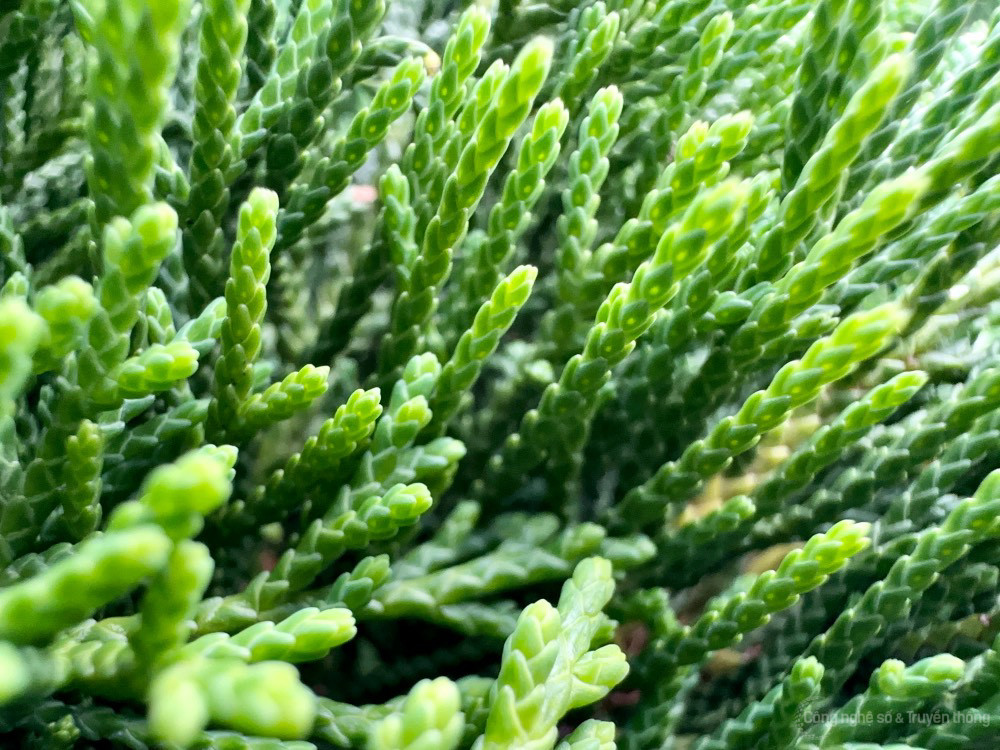 Tôi chưa từng nhìn kỹ những cây tùng như thế này. Tấm ảnh cận cảnh cho thấy rõ từng đốt lá của cây xếp đều đặn để tạo thành một nhánh cây chỉ lớn hơn que tăm một chút. Một tấm ảnh xanh mướt mang đến năng lượng tích cực giữa trưa nắng.