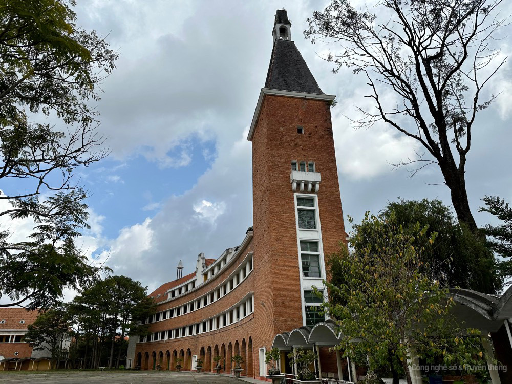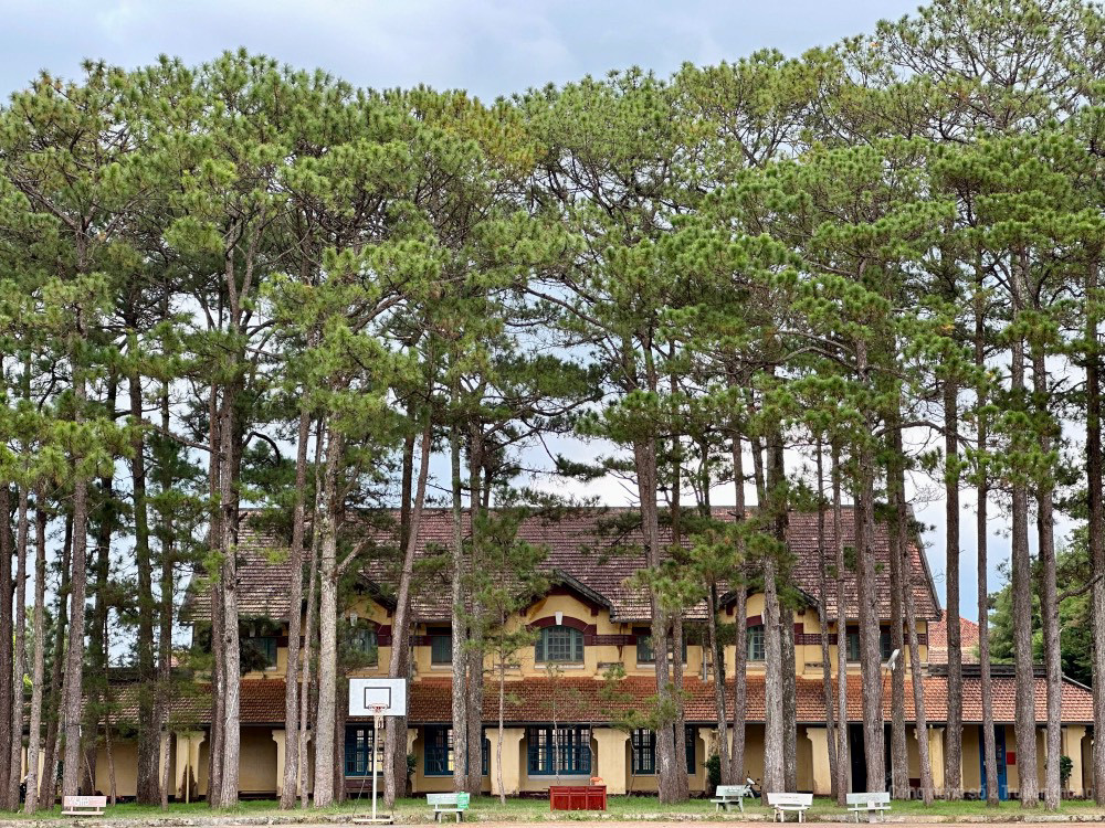 Sau khi thưởng thức thứ trái cây theo mùa của xứ cao nguyên, chúng tôi ghé Cao đẳng Sư phạm Đà Lạt - khối kiến trúc tôi thường hay ngắm nhìn từ phía bên kia Hồ Xuân Hương mỗi lúc bình minh. Trời âm u, nhiều mây, song tôi vẫn gắng ghi lại khung cảnh toà nhà gần trăm tuổi.