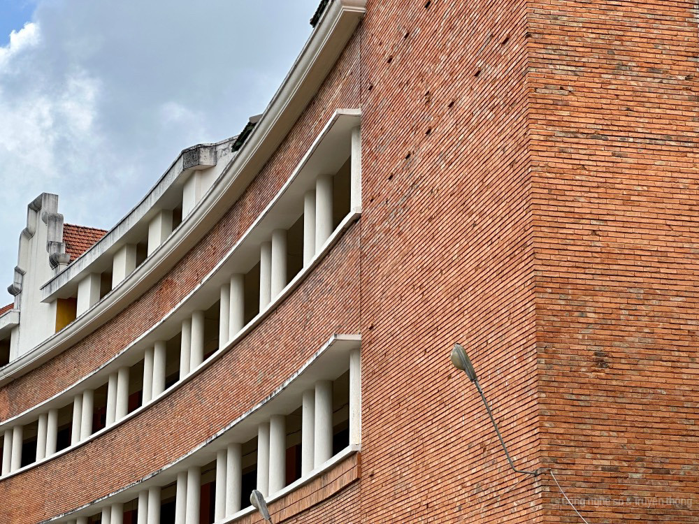 Đặc trưng của di tích phong cách Pháp này chính là dãy nhà hình vòng cung độc đáo. Toàn bộ gạch và ngói của toà nhà khi mới xây đều được vận chuyển từ đất nước của tháp Eiffel. Ảnh được chụp ở chế độ zoom 3x để thấy rõ những viên gạch xếp tỉ mỉ cạnh nhau tạo ra hình vòng cung đặc biệt.