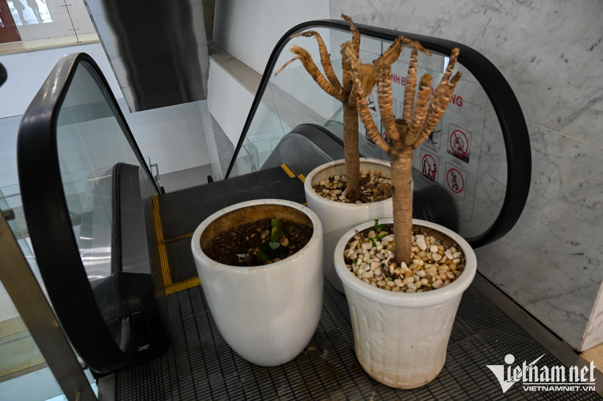 Hệ thống thang cuốn dừng hoạt động hoàn toàn. Các chậu cây được đặt ngay trước lối xuống để ngăn người đi qua.