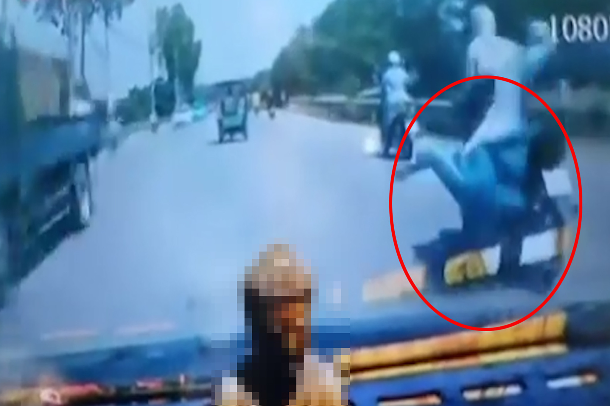 Theo hình ảnh trong clip, người ngồi sau xe máy mặc áo chống nắng loại dài, rộng trùm kín người. Trong quá trình di chuyển, gió đẩy vạt áo mắc vào bánh sau của xe nên và khiến người phụ nữ ngã xuống đường. Tình huống đặc biệt nguy hiểm khi đi ngay phía sau là ô tô.