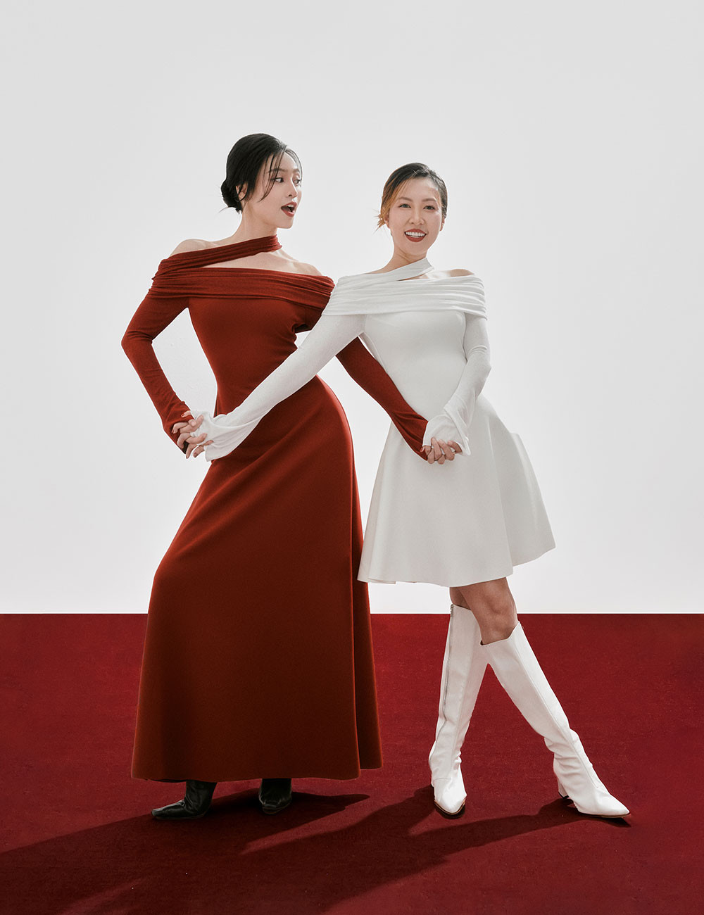 Ninh Dương Lan Ngọc và chị gái Lan Anh lựa chọn hai thiết kế váy trễ vai thanh lịch, mang đậm màu sắc lễ hội nằm trong BST Holiday.