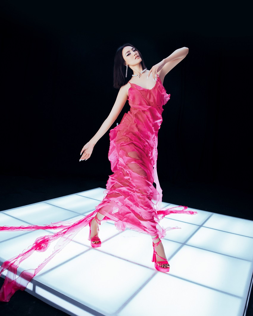 Khi nữ tính, khi lại quyến rũ, đôi lúc Ninh Dương Lan Ngọc lại gây bất ngờ với vẻ mong manh, thanh khiết, trong các thiết kế màu hồng vô cùng “bánh bèo”, nữ tính. Mỹ nhân 9X diện chiếc váy hồng với form phóng khoáng và ấn tượng đặc biệt thu hút sự quan tâm bởi những dải màu được sắp xếp ngẫu nhiên trên nền chất liệu xuyên thấu.