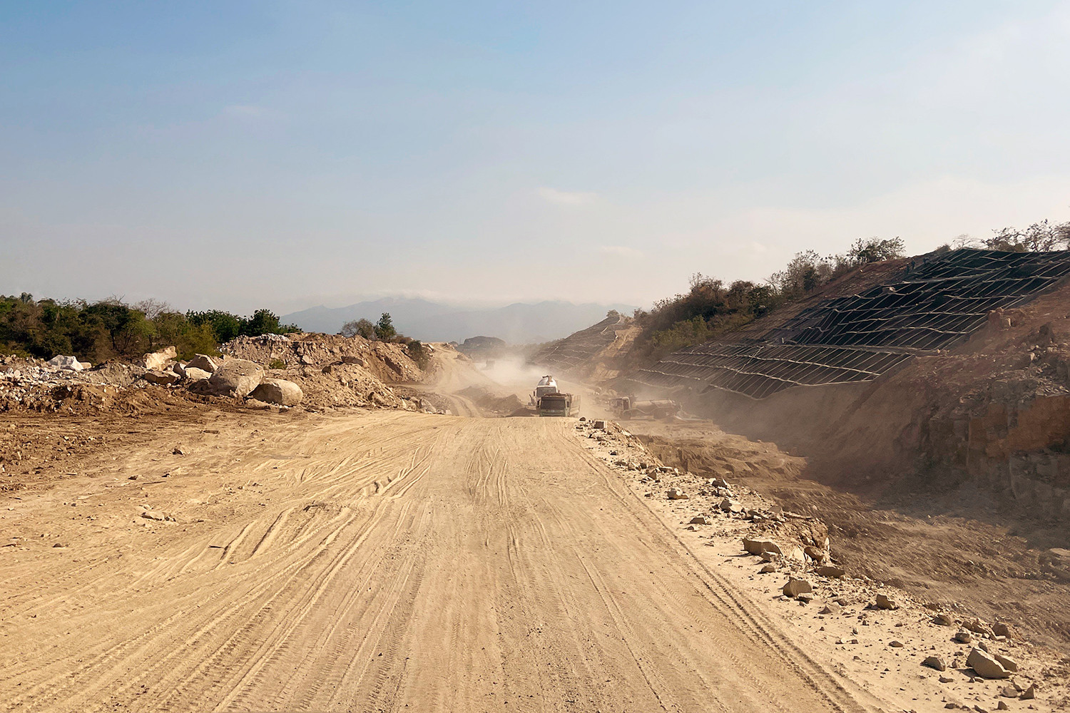Đoàn xe tải chạy trong công trình cao tốc, ra vào các mỏ khai thác đá lộ thiên. Nơi đây, nhiều máy đào, múc cấp tập thu đất đá, rồi cẩu lên thùng xe tải đang chờ. Các xe sau đó chở số đá này vào công trường dự án cao tốc Cam Lâm – Vĩnh Hảo.