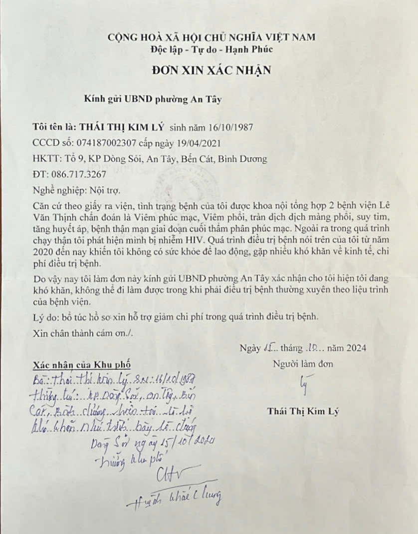 Khi còn khỏe, chị Lý làm thợ phụ ở tiệm tóc của người ta. Sau khi đổ bệnh thì không đi làm được nữa. Mọi chi phí sinh hoạt và chữa bệnh đều do bạn trai lo liệu. Suốt mấy năm nay, riêng tiền chữa bệnh cho chị chẳng tính xuể. Họ đã trả phòng trọ ở TP.HCM để về quê sinh sống. Trong lần nhập viện trước, bạn trai của chị phải bán chiếc xe máy vốn là phương tiện mưu sinh duy nhất.