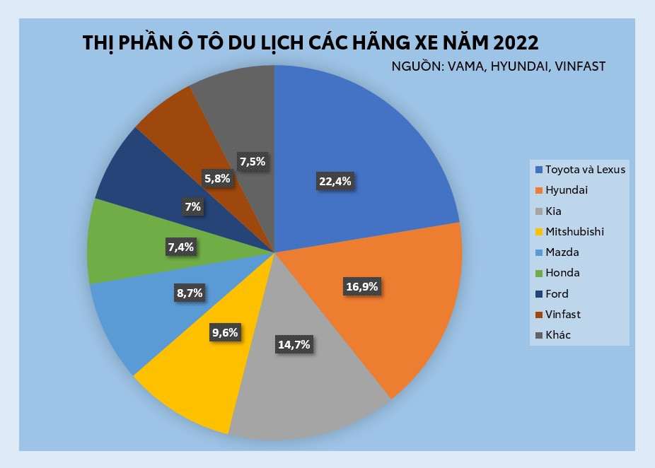 Theo số liệu thống kê từ Hiệp hội Các nhà sản xuất ô tô Việt Nam (VAMA), Hyundai Thành Công và VinFast, doanh số toàn thị trường năm 2022 đạt 509.141 xe ô tô các loại - con số ấn tượng nhất trong gần 30 năm phát triển của ngành ô tô Việt Nam. Trong đó, nếu chỉ tính riêng mảng xe du lịch thì với 413.455 xe đã được đến tay người tiêu dùng. Trong đó, nhiều hãng xe có doanh số và tốc độ tăng trưởng ấn tượng. Trong đó, Toyota Việt Nam dẫn đầu mảng xe du lịch 2022 với 92.625 xe bán ra thị trường (bao gồm xe Lexus)...