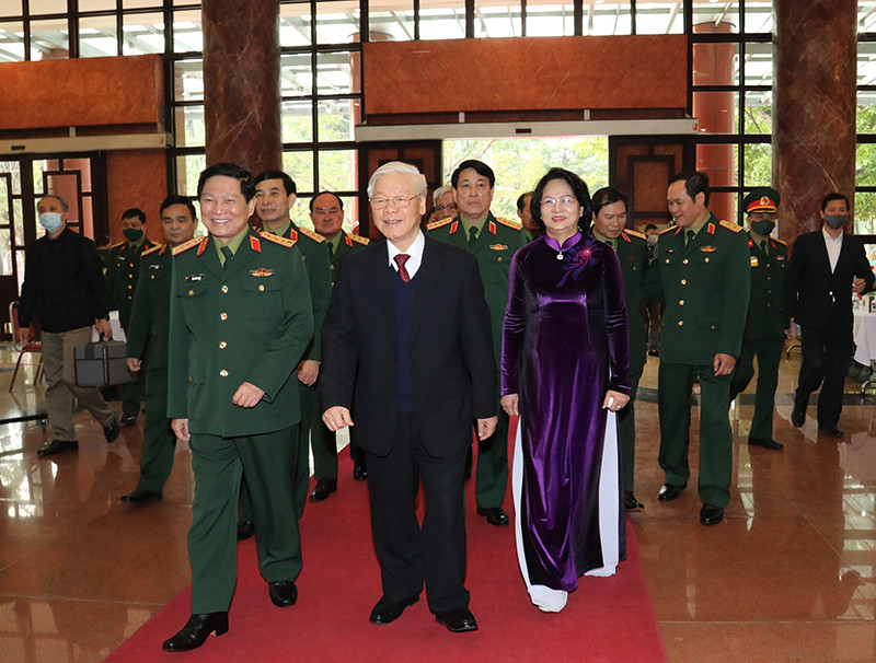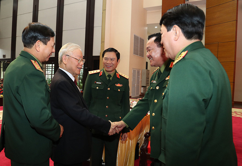Tổng Bí thư Nguyễn Phú Trọng với các đồng chí lãnh đạo Bộ Quốc phòng tại Hội nghị quân chính toàn quân năm 2020, tháng 12/2020. (ảnh: Nguyễn Bằng)