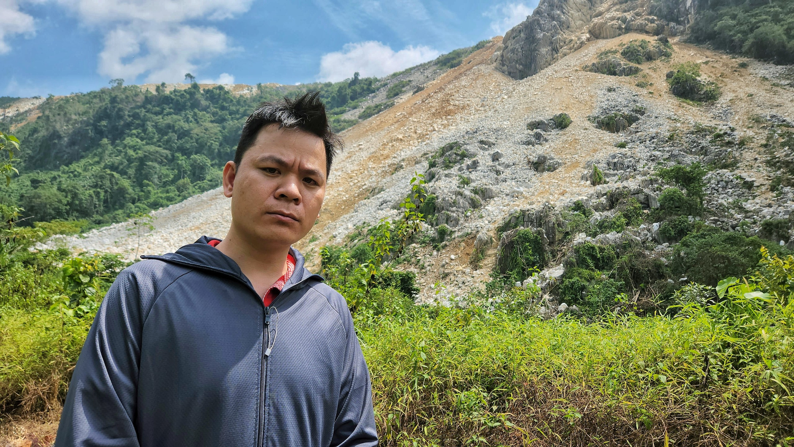 "Cuối năm 2022, khi đang đi phát nương rẫy, tôi và bố phải bỏ lại xe máy để tháo chạy khi thấy đá trút xuống từ đỉnh mỏ đá do Công ty Hùng Đại Sơn khai thác. Khi quay lại lấy xe máy thì thấy chiếc xe bị đá văng vào gây biến dạng", anh Quyết kể lại.