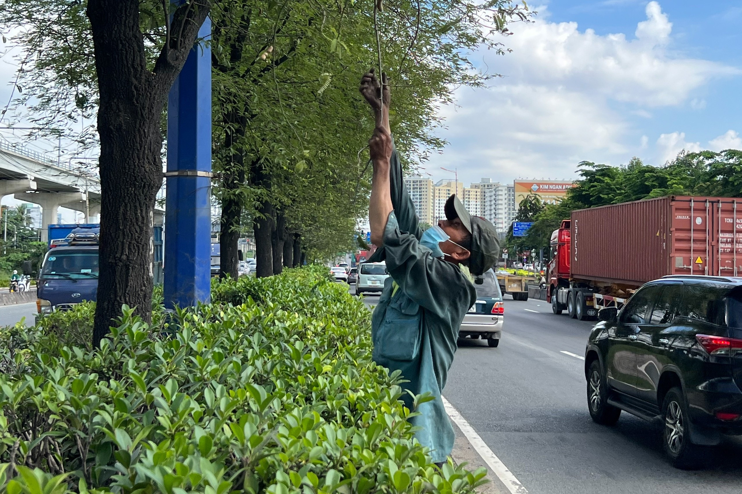 Tờ mờ sáng, ông Lâm Hoàng Tuấn, 48 tuổi, chạy xe máy từ quận 1 về TP Thủ Đức. Dải phân cách đoạn từ ngã tư Bình Thái đến ngã tư Thủ Đức dọc xa lộ Hà Nội có hàng chục cây me trĩu quả. Đây là nơi kiếm tiền của ông Tuấn, ngày 29/11.