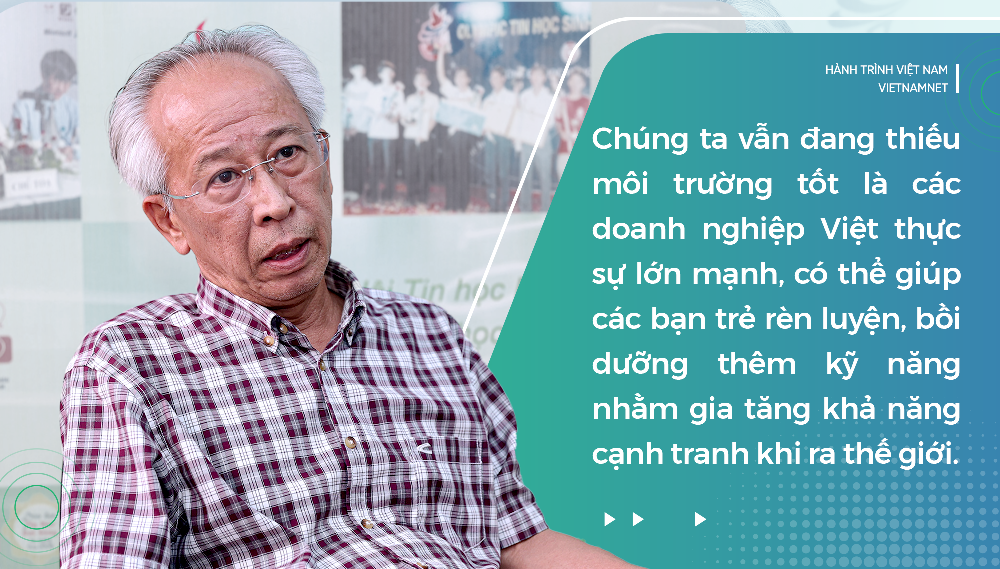 Một vấn đề khác, theo Tổng Thư ký Hội Tin học Việt Nam, cũng cần phải đặc biệt lưu tâm: “Chúng ta vẫn đang thiếu môi trường tốt là các doanh nghiệp Việt thực sự lớn mạnh, có thể giúp các bạn trẻ rèn luyện, bồi dưỡng thêm kỹ năng nhằm gia tăng khả năng cạnh tranh khi ra thế giới. Hầu hết lực lượng tốt nhất của chúng ta thường hướng tới các doanh nghiệp nước ngoài. Tôi biết có bạn đã từng làm công nghệ cho một tập đoàn rất nổi tiếng làm về outsourcing ở Việt Nam, trả lương mức khá, nhưng chỉ làm vài tháng là bạn bỏ việc vì thấy “chẳng có gì để làm”. Vấn đề không phải lương cao hay thấp mà các bạn muốn được “lớn”, được tiếp cận xu hướng mới và được thách thức. Tôi rất mong các doanh nghiệp công nghệ thông tin Việt Nam lớn mạnh về công nghệ nhanh hơn, thay vì chỉ đi làm những sản phẩm theo kiểu “may đo” thì cần phải bắt đầu có những đột phá về công nghệ và phương thức tuyển dụng người tài, nằm trong nhóm doanh nghiệp dẫn đầu, khi đó, các bạn trẻ sẽ có nhiều cơ hội phát triển, vươn tầm quốc tế hơn”.