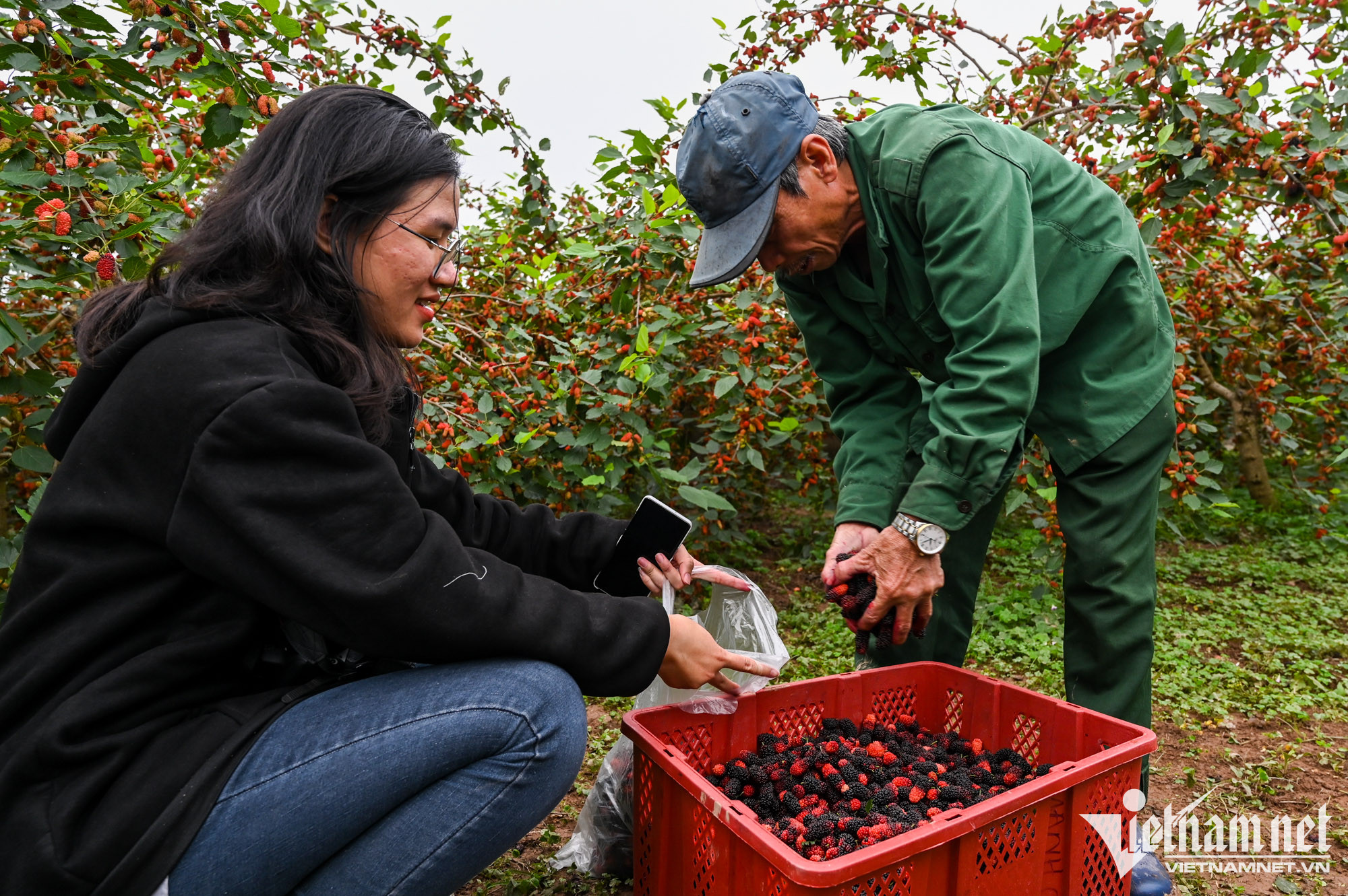 Chị Lan (quận Hoàng Mai) đến tận vườn thu mua 1 tạ dâu sau khi đã đặt trước. Không giống một số loại hoa quả khác, riêng giá dâu tằm càng về cuối vụ sẽ càng lên, vì không có hàng bán.