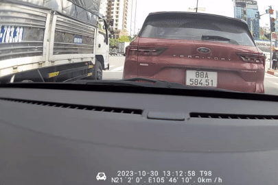 Đáng chú ý, chiếc Toyota đã cố tình vượt ở nơi có vạch liền và vượt xe tải nặng có thùng hàng dài, gây nguy hiểm cho xe có camera hành trình. May mắn, cả hai xe đã kịp thời phanh tránh một pha đối đầu cực kỳ nguy hiểm. Tuy nhiên, do xe Toyota Rush đi quá sát xe tải nặng nên khiến tài xế xe tải phải phanh gấp, làm hàng chục ô tô đang nối đuôi phía sau dừng theo.