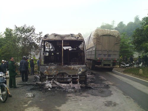 bộ chiếc xe cùng hàng hóa và 3 xe máy bị thiêu rụi sau đó, chỉ còn trơ lại khung