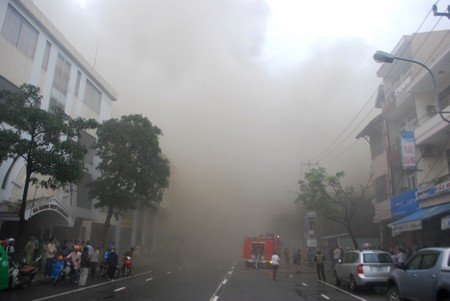 Khói từ đám cháy đã bốc cao, bao phủ cả một khu vực. Các tuyến đường xung quanh đã được phong toả để lực lượng chức năng làm nhiệm vụ.