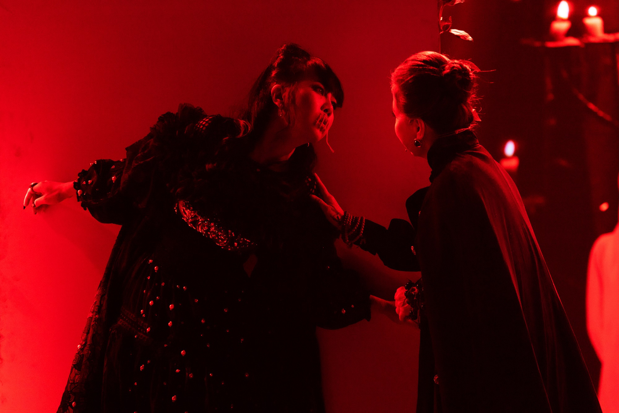 Trên sân khấu, NSND Kim Xuân, MC Trác Thúy Miêu và người mẫu Trang Trần diễn nghi lễ đổi mạng - một trích đoạn trong bộ phim - ngay trên sân khấu. Không khí ma mị cùng diễn xuất của nghệ sĩ gạo cội gây ấn tượng người tham dự.