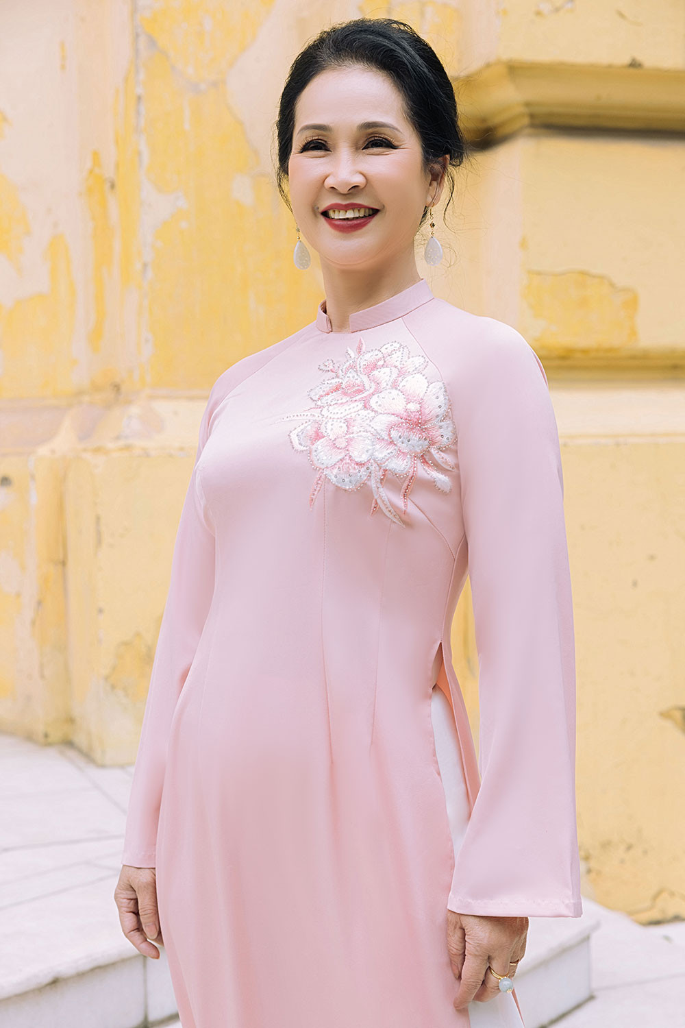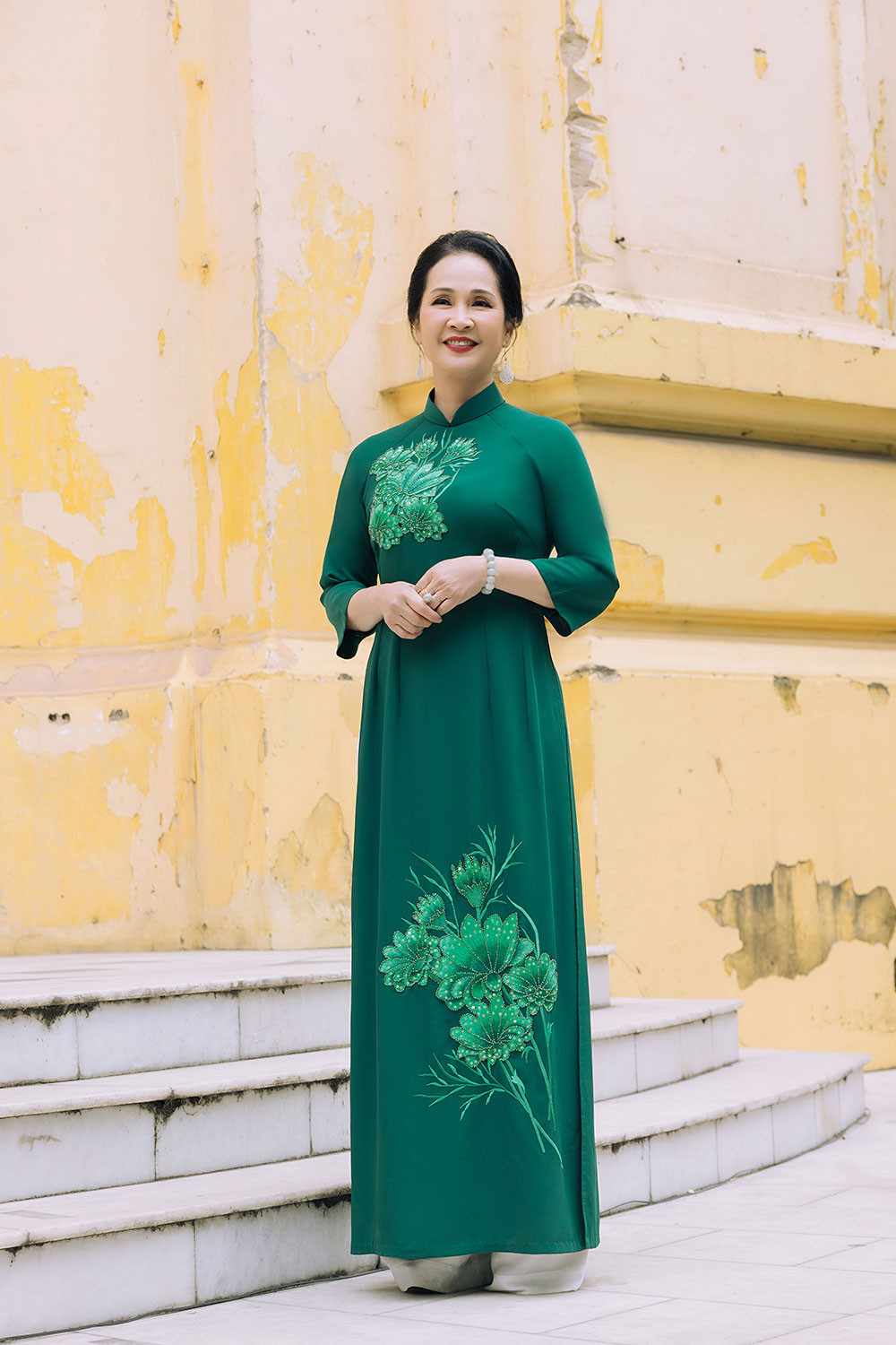 Sự tinh tế của trang phục còn ở những chi tiết đắp, kết cườm được thể hiện rõ nét, nổi bật như những giọt sương mong manh trên chất liệu nhung the. Phom áo truyền thống ôm sát khoe đường cong cơ thể.