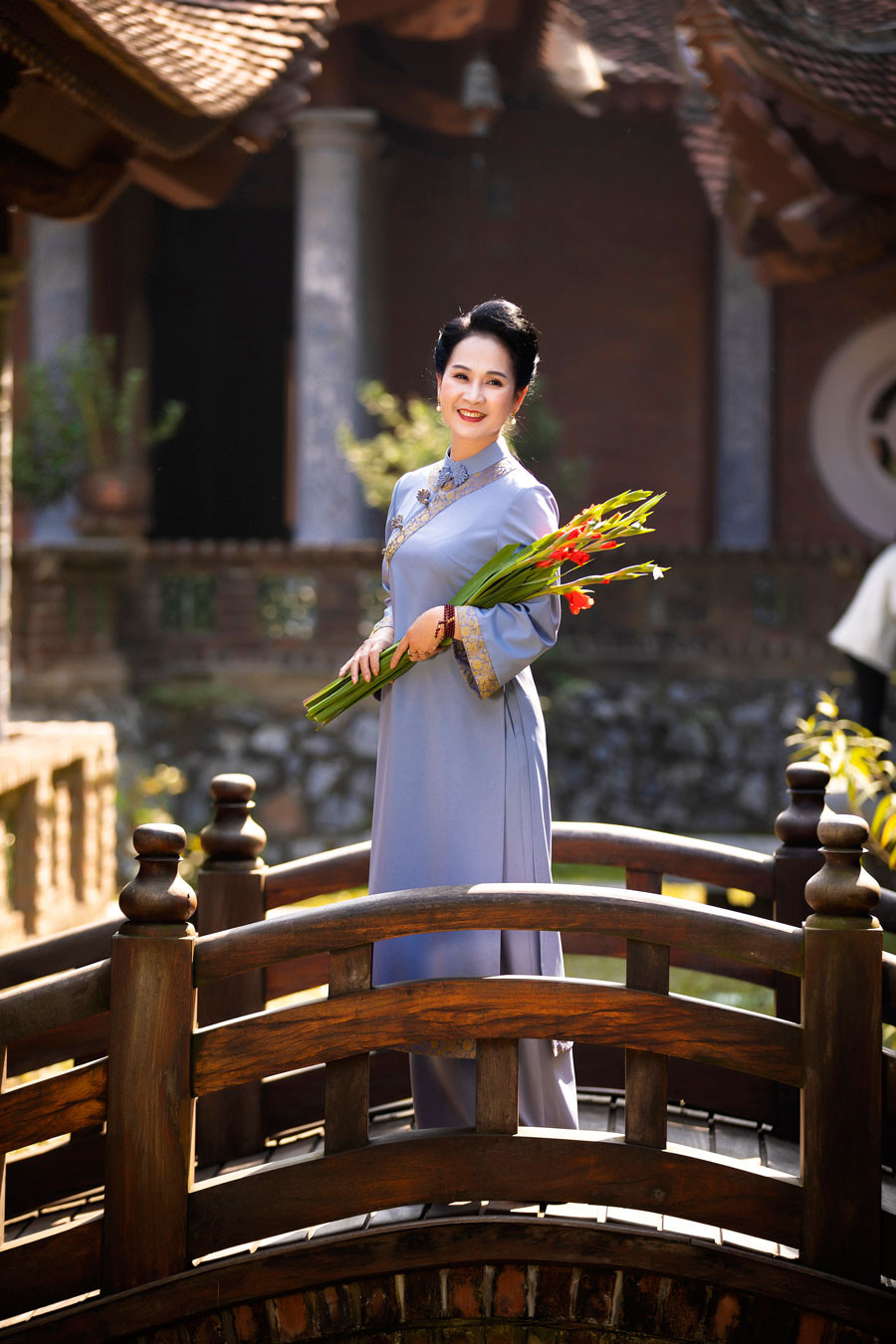 NSND Lan Hương và NSƯT Chiều Xuân diện các thiết kế trong bộ sưu tập Bạch Liên của Hà Bùi vãn cảnh chùa những ngày cuối năm.