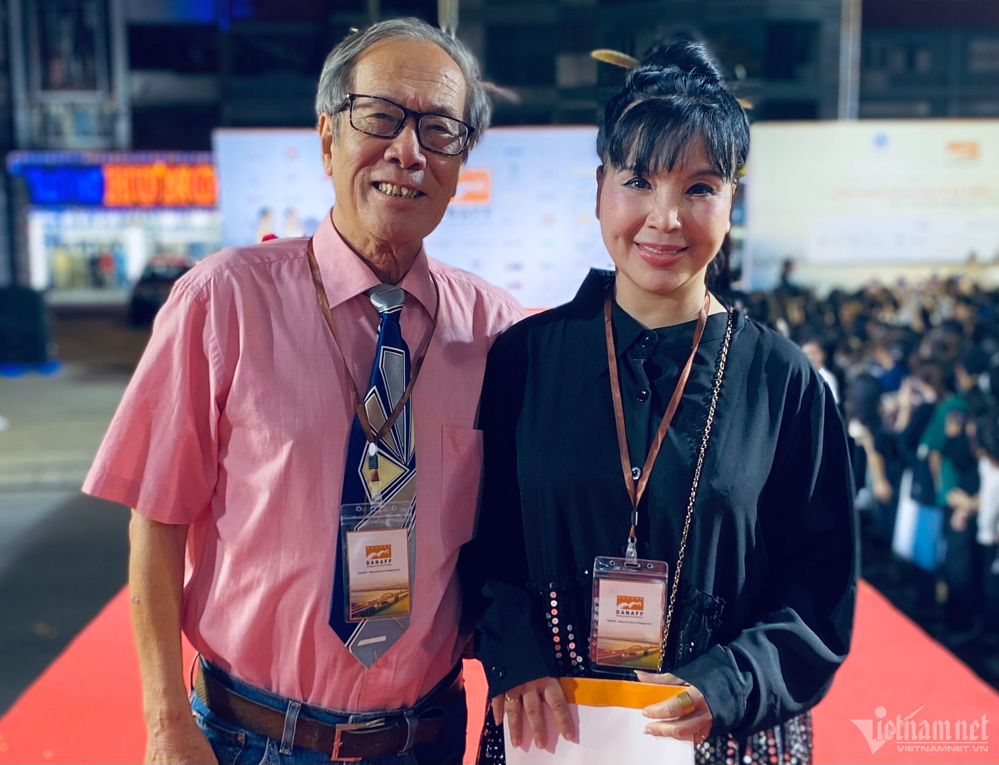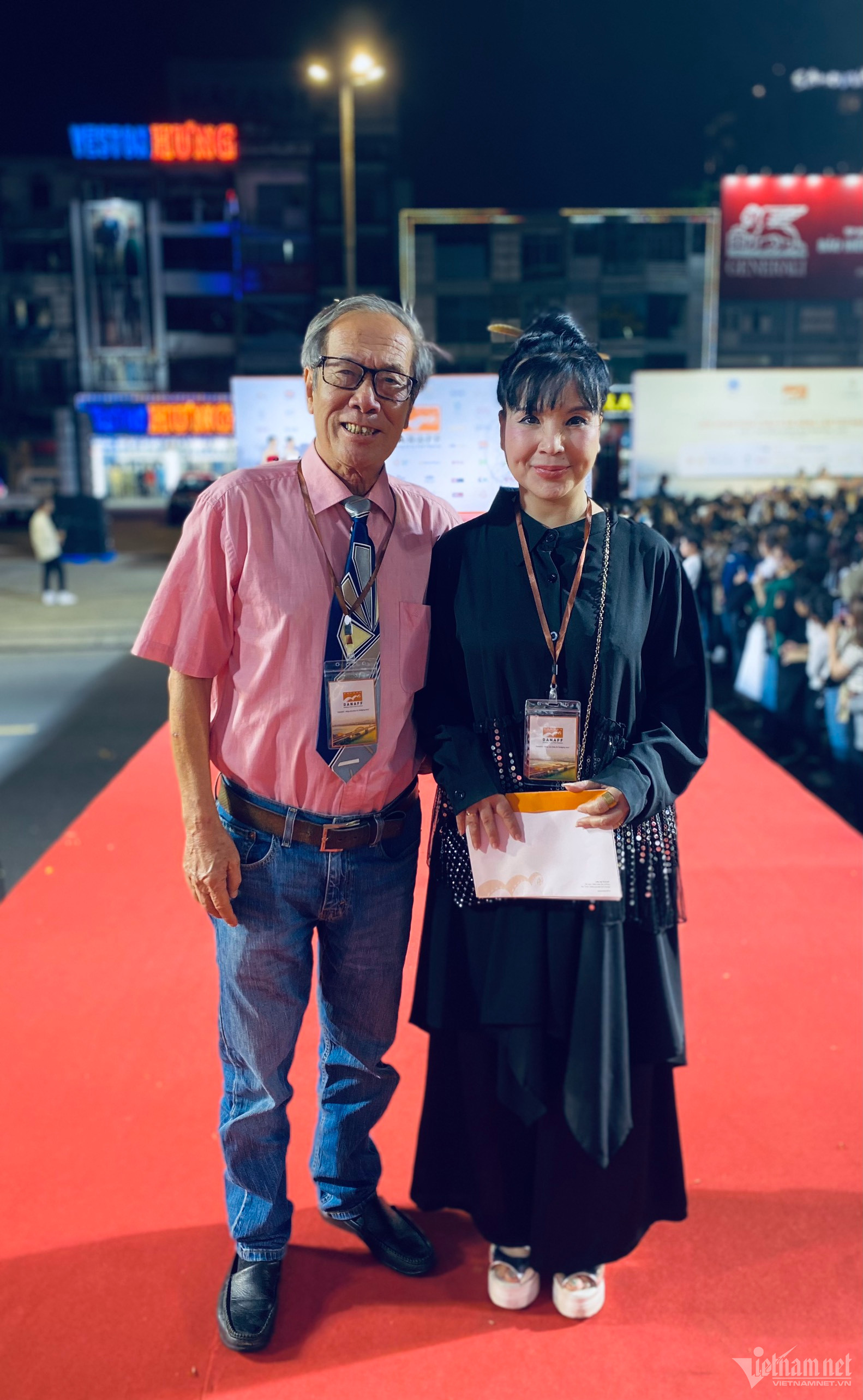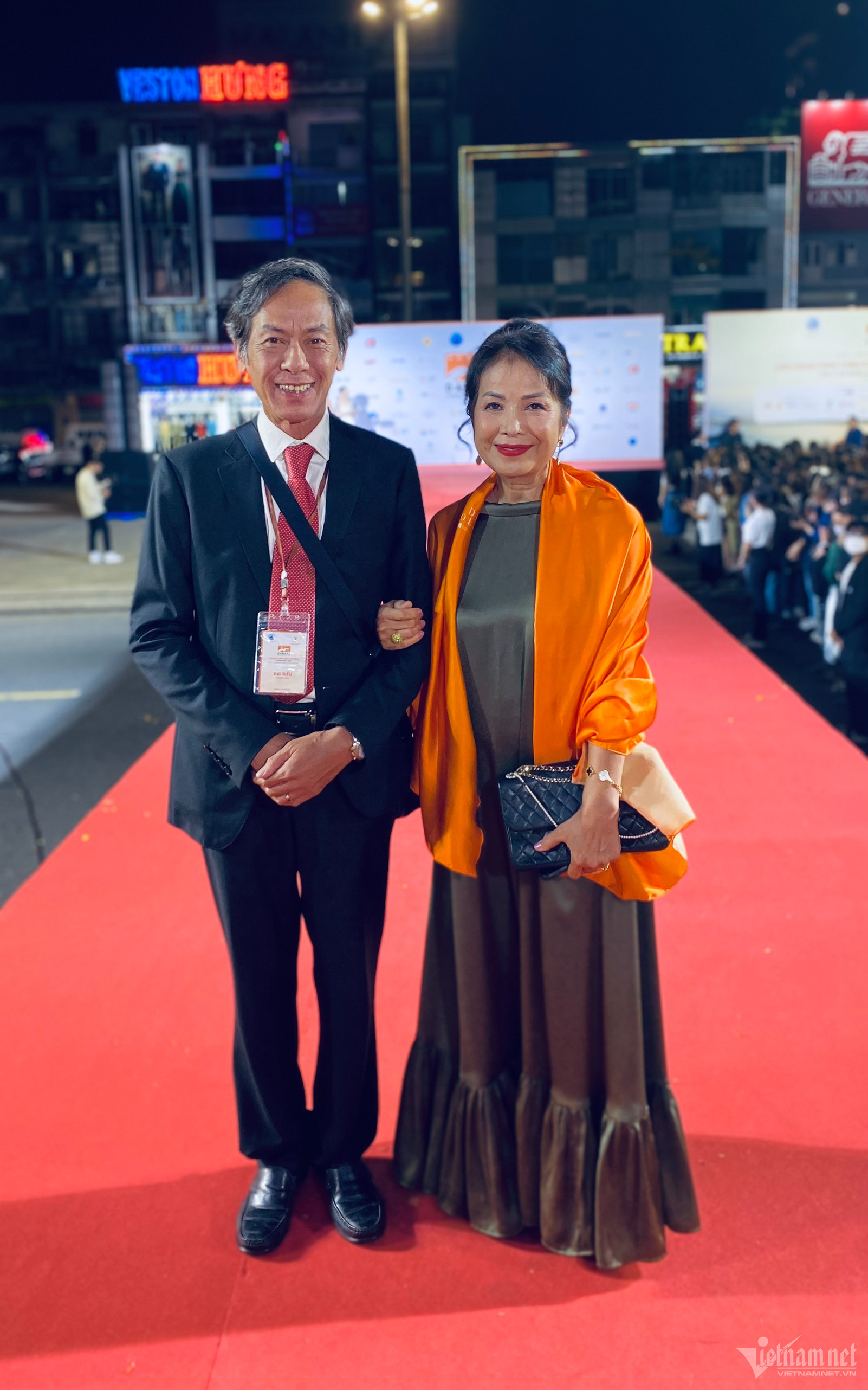 NSND Lan Hương sánh đôi tình tứ bên NSƯT Tất Bình trên thảm đỏ lễ bế mạc Liên hoan phim châu Á Đà Nẵng.
