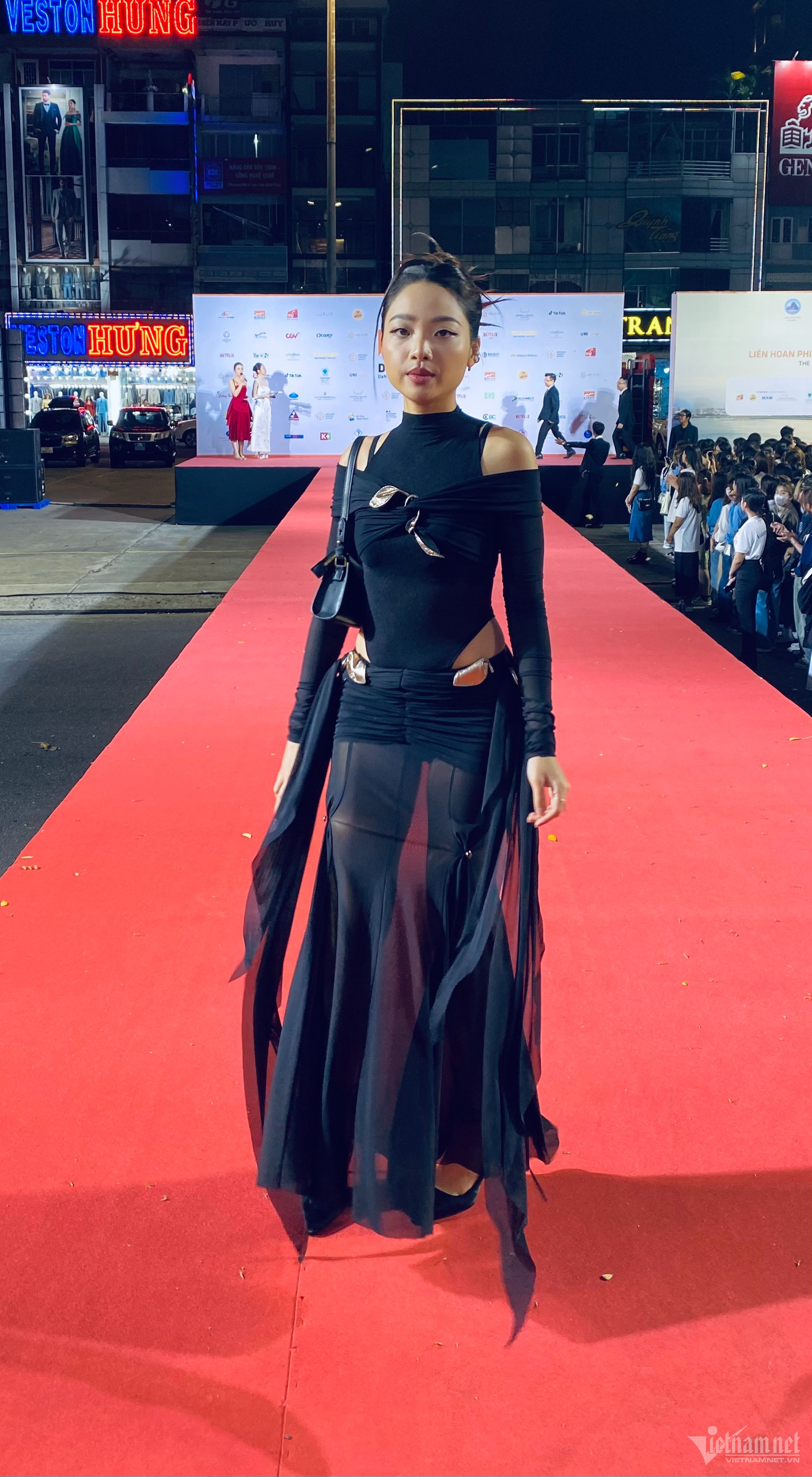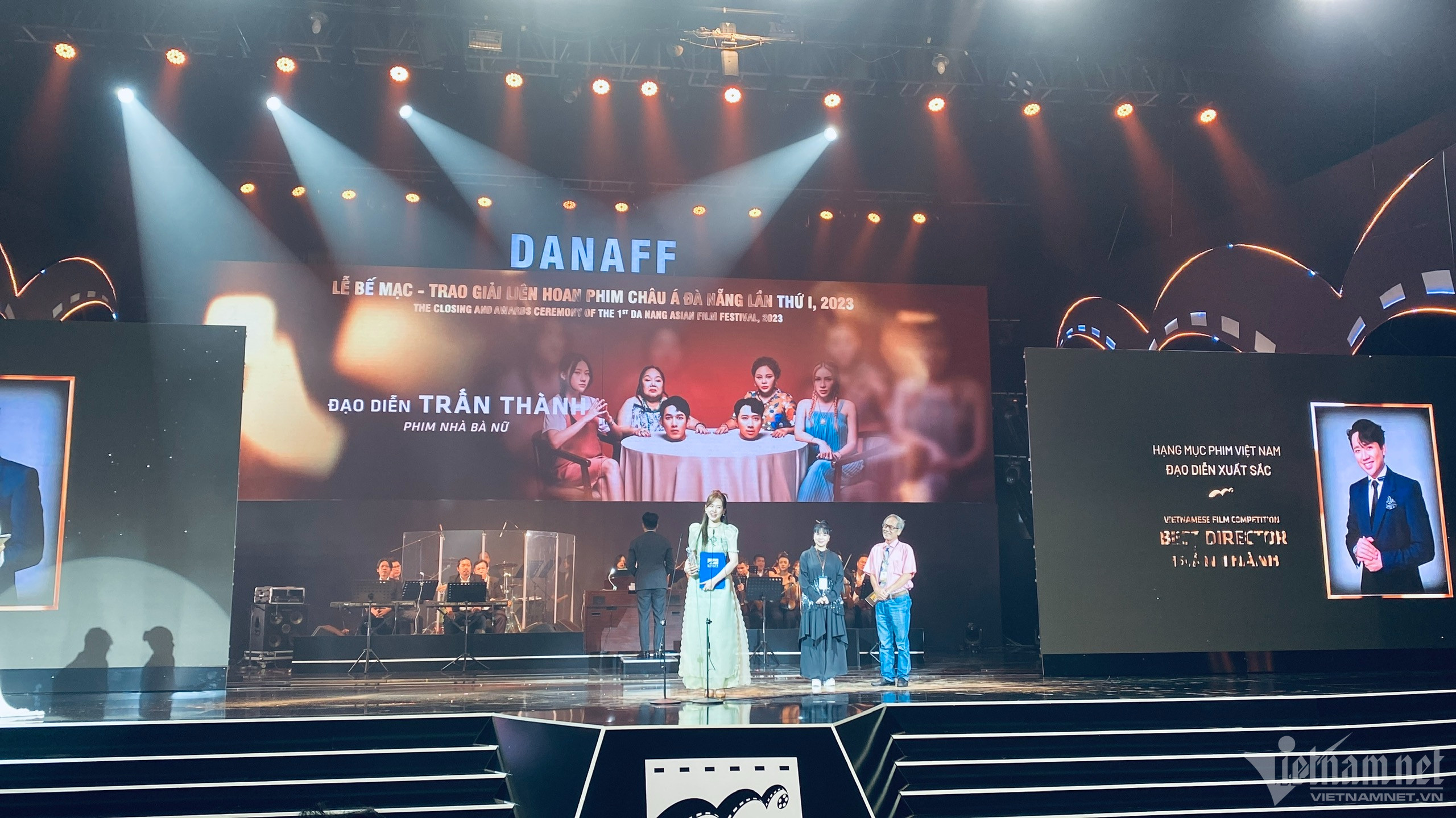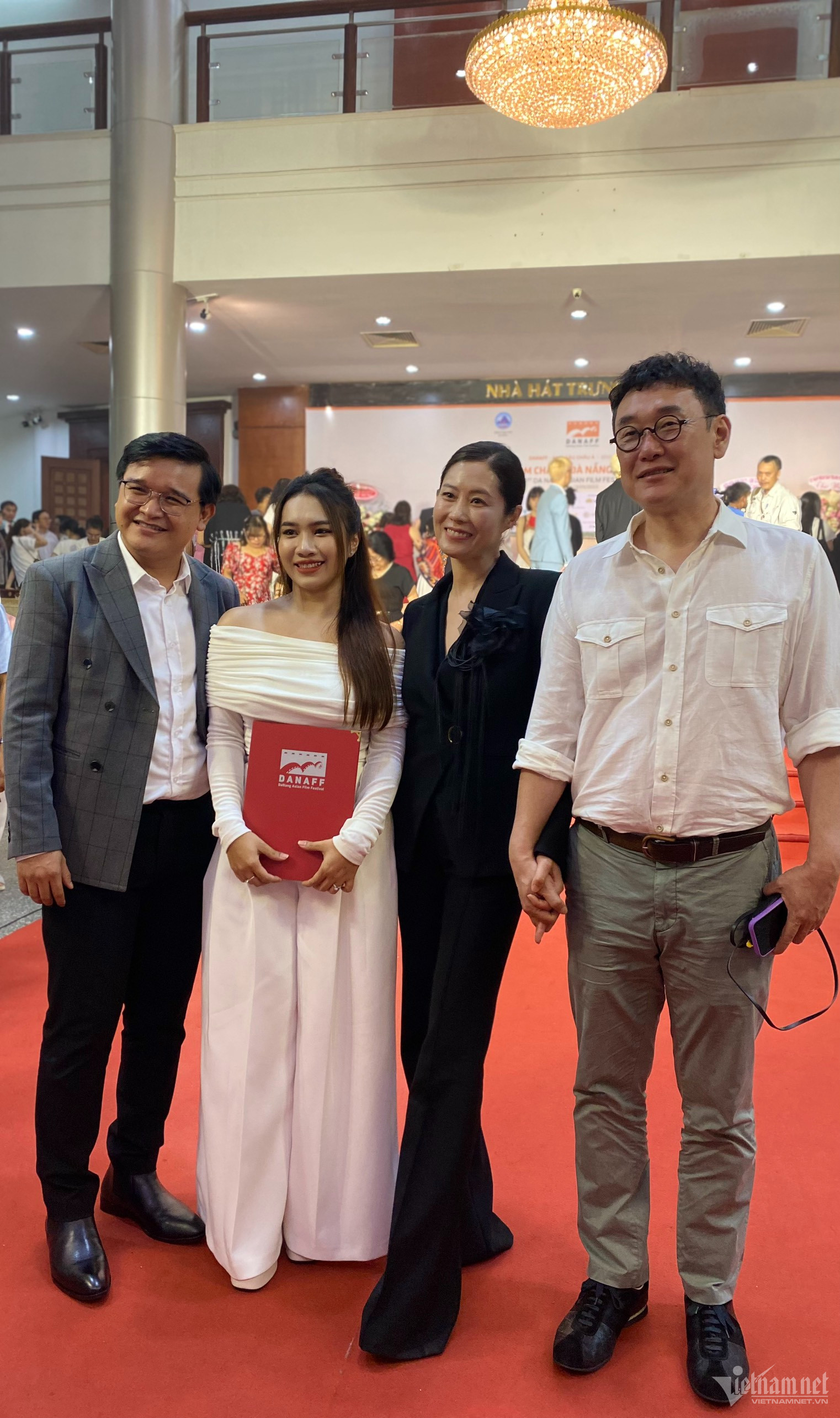 NSND Lan Hương và NSƯT Tất Bình là hai nghệ sĩ được BTC mời tới trao giải hạng mục Đạo diễn xuất sắc nhất (Phim Việt Nam dự thi). Ở tuổi 60 NSND Lan Hương vẫn rạng ngời hạnh phúc bên NSƯT Tất Bình - người chồng hơn chị tới 14 tuổi trong cuộc hôn nhân dài hơn 30 năm. NSND Lan Hương và NSƯT Tất Bình đã đồng hành với nhau ở rất nhiều kỳ LHP hay giải thưởng điện ảnh. Trên sân khấu lễ trao giải NSND Lan Hương có màn giới thiệu tên khá hài hước. Nữ nghệ sĩ được chồng nhường cơ hội trao giải cho Hari Won - vợ Trấn Thành khi hai người công bố giải Đạo diễn xuất sắc nhất.Trấn Thành bận show Rap Việt không tới nhận giải nên đã 'cử' Hari Won cùng em gái Uyển Ân và diễn viên Khả Như của 'Nhà bà Nữ' tới sự kiện. Tuy nhiên ban đầu chỉ có Uyển Ân và Khả Như sánh vai trên thảm đỏ vì Hari Won đến muộn. NSND Bùi Bài Bình sánh bước cùng NSƯT Minh Trang tại thảm đỏ lễ bế mạc Liên hoan phim châu Á Đà Nẵng. Hai người từng đóng vai vợ chồng trong phim truyền hình 'Chiều ngang qua phố cũ'. Diễn viên Quinn Trúc Trần của phim Hollywood gây sốt toàn cầu gần đây - 'A Tourist's Guide to Love' ('Bí kíp tình yêu của một du khách') gợi cảm trong chiếc đầm đen cut out phá cách.Quinn Trúc Trần giữ vẻ đẹp lạnh lùng trước ống kính khi hội ngộ đồng nghiệp trên thảm đỏ. Chia sẻ với VietNamNet, nữ diễn viên cho biết sau 'A Tourist's Guide to Love' cô chưa có kế hoạch đóng phim tiếp theo. Đồng Ánh Quỳnh nổi bật trên thảm đỏ với vest đen cách điệu không nội y. Đả nữ của phim 'Thanh Sói' khoe chân dài và vòng eo trong chiếc quần suông dài chấm đất. Vợ chồng đạo diễn Võ Thanh Hoà hội ngộ vợ chồng diễn viên Hàn Quốc Moon So-ri ở thảm đỏ sau khi kết thúc lễ trao giải. Moon Sori là Chủ tịch BGK hạng mục Phim châu Á tại Liên hoan phim châu Á Đà Nẵng. Võ Thanh Hoà chia sẻ với nữ diễn viên rằng anh rất thích phim 'Phong hậu' mà Moon So-ri đóng khiến nữ diễn viên rất hạnh phúc.
