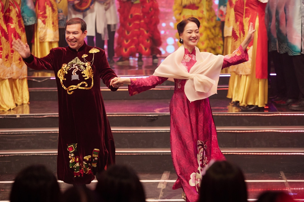 NSND Lê Khanh và Quang Thắng cùng mặc áo dài thêu tay linh vật 12 con Giáp của nhà thiết kế Tăng Mai Anh dắt tay nhau trên sân khấu chương trình Tết thường niên - "12 con giáp" của VTV.