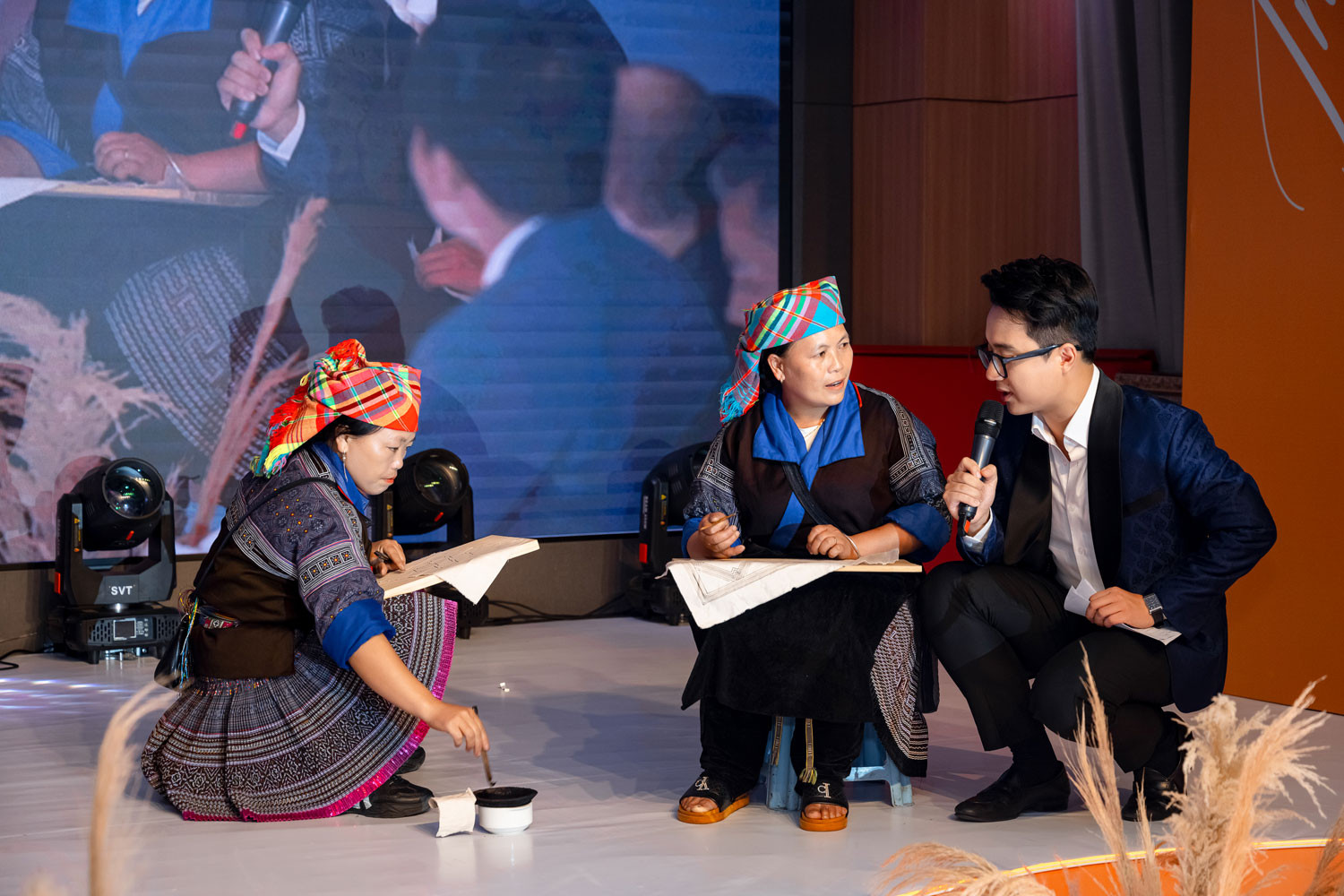 “Để có được những tấm vải này, những người phụ nữ H’Mông đã thực hiện kỹ thuật vẽ bằng sáp ong. Họ dùng thanh tre nhỏ dài khoảng 7cm, kết hợp với ngòi bút bằng lá đồng và vẽ trên vải. Khi vẽ, họ ngồi bên bếp lửa, chấm bút vào chảo sáp ong đang nóng đặt trên than hồng, đưa tay kẻ những đường thẳng trên vải và giữ sao cho lượng sáp chảy đều, không loang lổ. Quy trình mới nghe tưởng như đơn giản nhưng để có được một tấm vải hoàn chỉnh, bà con phải bỏ ra rất nhiều thời gian, công sức và tâm tư nữa”, NTK Nguyễn Lan Anh tâm sự.
