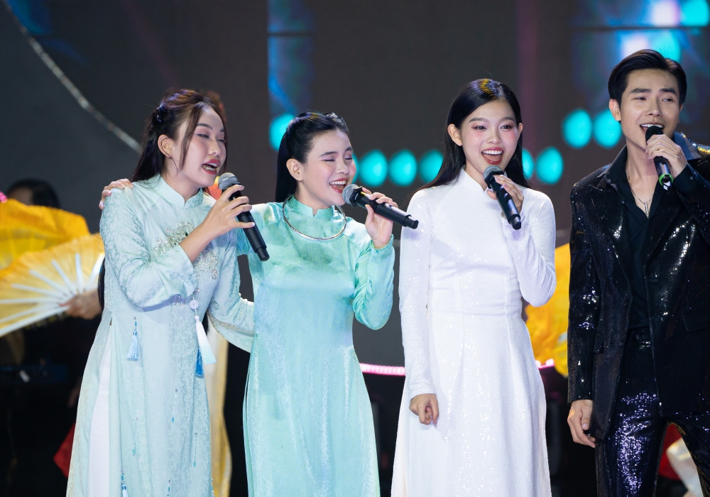 Tối 12/10, liveshow Dấu ấn - Cung tơ hòa điệu của Quỳnh Trang - Tuyết Nhung - Thiêng Ngân được tổ chức tại Nhà hát Bến Thành, TPHCM. Đây là sân khấu hiếm hoi mà 3 con gái nuôi Phi Nhung hội ngộ sau 3 năm giọng ca Bông điên điển qua đời.