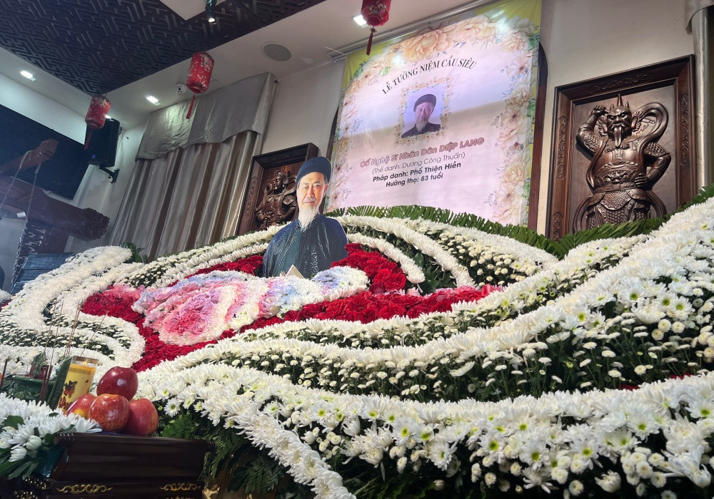 Nghệ sĩ gạo cội làng cải lương Diệp Lang qua đời ở Mỹ, hưởng thọ 83 tuổi. Ngoài tang lễ diễn ra ở Mỹ, gia đình và đồng nghiệp tổ chức lễ tưởng niệm những đóng góp của ông cho làng nghệ thuật tại Việt Nam. Được sự ủy thác của gia đình, NSƯT Châu Thanh cùng NSƯT Ngọc Huyền, đạo diễn Xuân Phước đồng tổ chức lễ tưởng niệm tại chùa Tường Nguyên (Q.4, TPHCM) với sự hỗ trợ của Đại đức Thích Minh Phú.Mọi người có mặt từ sớm, cùng chư tăng tụng kinh cầu siêu cho cố nghệ sĩ. Sau đó là phần lễ viếng tưởng niệm NSND Diệp Lang. NSƯT Ngọc Huyền và Châu Thanh - 2 người đàn em, học trò của cố nghệ sĩ cầu nguyện mong vong linh ông được siêu thoát. Trong ký ức của họ, cố nghệ sĩ nghiêm khắc nhưng tận tình nâng đỡ đàn em. Hai nghệ sĩ thực hiện nghi thức dâng cúng cơm NSND Diệp Lang. Ngọc Huyền là người gắn bó với cố nghệ sĩ nhiều năm tại Mỹ. Cô thường xuyên tới lui, thăm nom ông do nhà 2 người gần nhau. Thay vì đặt di ảnh NSND Diệp Lang, ban tổ chức lễ tưởng niệm dựng bệ thờ kết hoa tươi với hình ảnh cố nghệ sĩ trong tạo hình nhân vật kinh điển của ông. Nghệ sĩ Phú Quý xúc động trong giây phút làm lễ. Ông gọi Diệp Lang là bậc thầy về kép độc, khuôn mẫu của kép lão. Tài năng lẫn đạo đức của cố nghệ sĩ là tấm gương sáng cho thế hệ đàn em noi theo. Nghệ sĩ Linh Tâm là thế hệ đàn em, được Diệp Lang chỉ dạy nhiệt tình. Anh từng đóng cùng cố nghệ sĩ một số băng cải lương trước khi ông sang Mỹ định cư. NSƯT Thanh Nguyệt dù không khỏe vẫn cố gắng đến thắp hương. Nữ nghệ sĩ nói bà đau lòng khi chứng kiến từng đồng nghiệp lần lượt ra đi thời gian qua. Lễ tưởng niệm diễn ra đến 22h cùng ngày. Tại Mỹ, các nghệ sĩ cũng đến chia buồn cùng vợ và các con của cố nghệ sĩ. Người thân của NSND Diệp Lang từ quê Đồng Tháp lên tham dự lễ tưởng niệm. Họ cài hoa trắng tưởng nhớ ông. "Do hoàn cảnh cách trở, chúng tôi không kịp nhìn mặt em lần cuối. Nguyện cầu em được siêu thoát", chị vợ Diệp Lang cho biết. Đạo diễn Xuân Phước là thành viên ban tổ chức lễ. "Lễ tưởng niệm nghệ sĩ Diệp Lang để anh chị em làm nghề, những người gắn bó một phần ký ức, kỷ niệm về ông, khán giả thân thương đến thắp một nén hương tiễn biệt", anh nói. NSND Diệp Lang tên thật là Dương Công Thuấn, sinh năm 1941, quê gốc ở Châu Thành, Đồng Tháp. Ông được giới mộ điệu cải lương biết tới và hâm mộ qua các vai kép độc, kép lão trong các vở cải lương kinh điển.