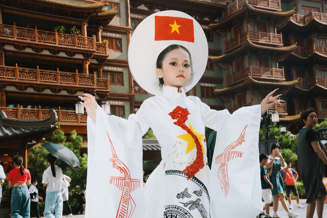 NTK Thạch Linh cùng Á hậu nhí Miss Baby Việt Nam 2023 Nhật Ánh khoe hình ảnh áo dài có hình bản đồ Việt Nam tại nhiều địa điểm du lịch nổi tiếng của Trung Quốc.