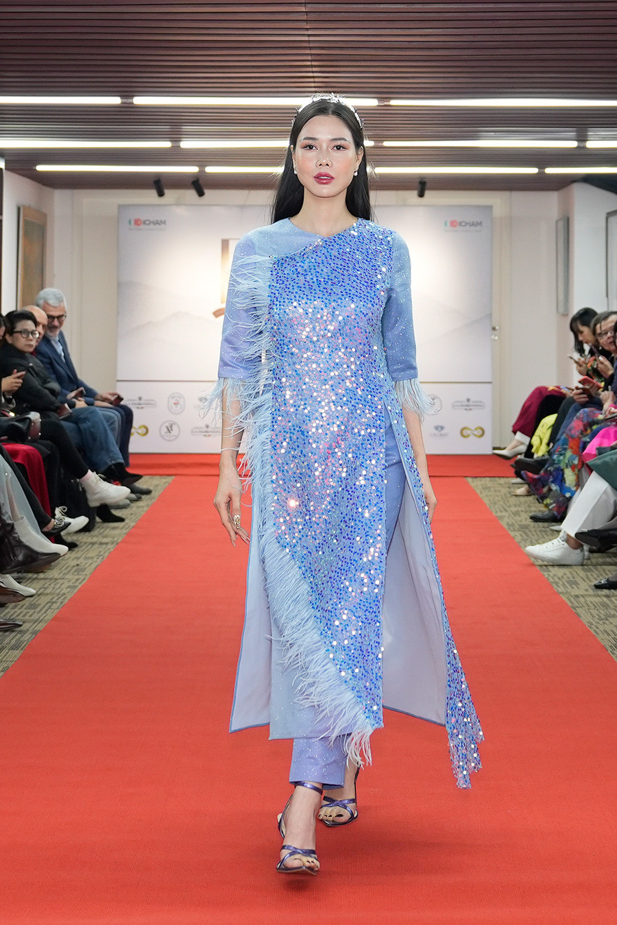 “Giao lưu” với NTK người Ý trong buổi trình diễn lần này là các thiết kế áo dài thuộc BST Hoa cúc và mặt trời của NTK Lasen Vũ.