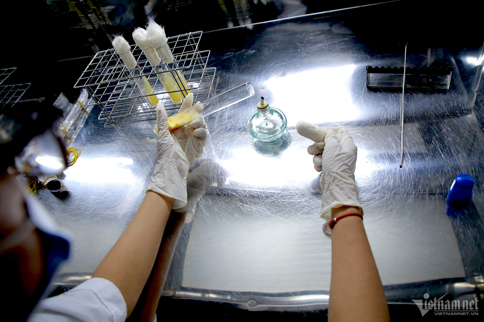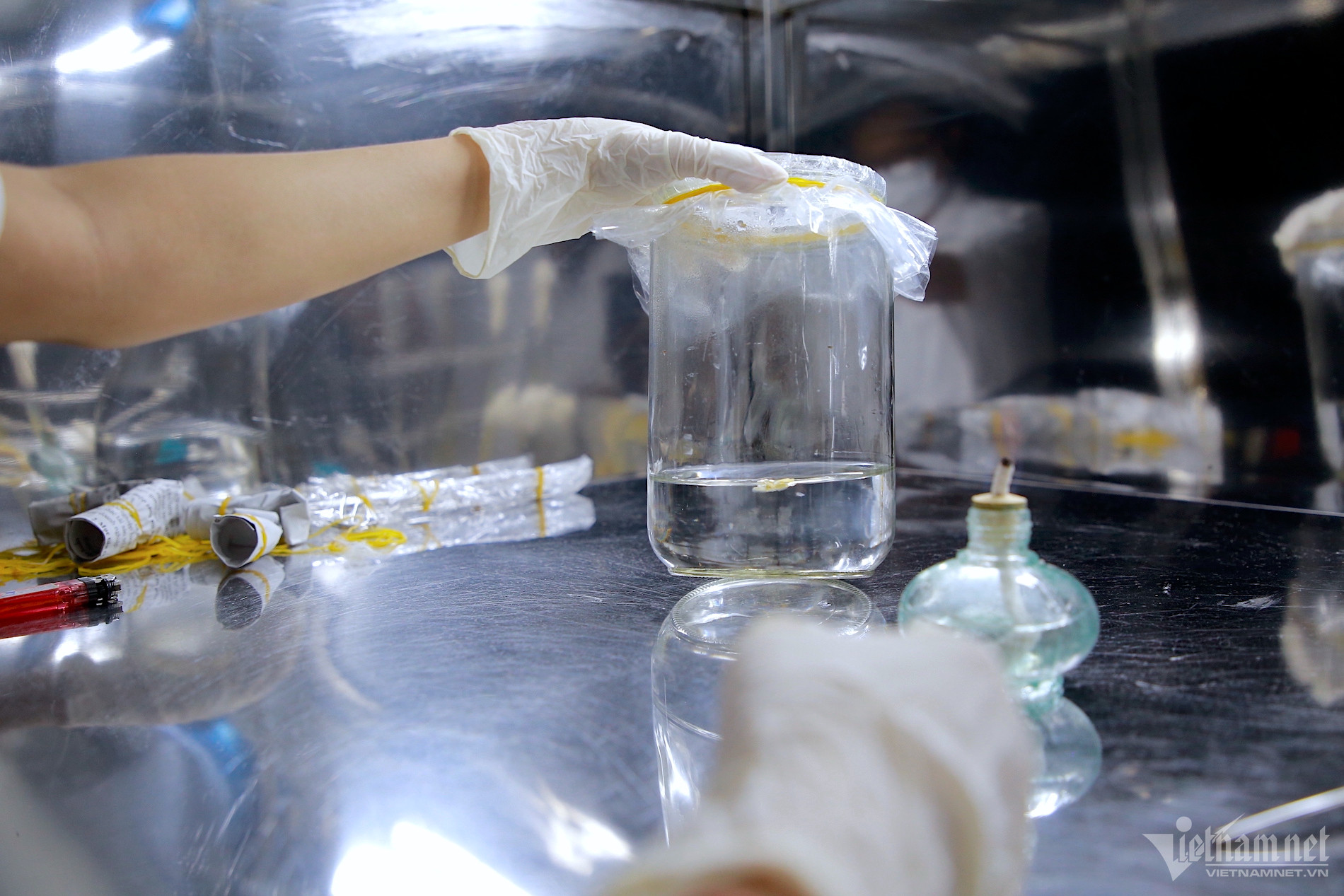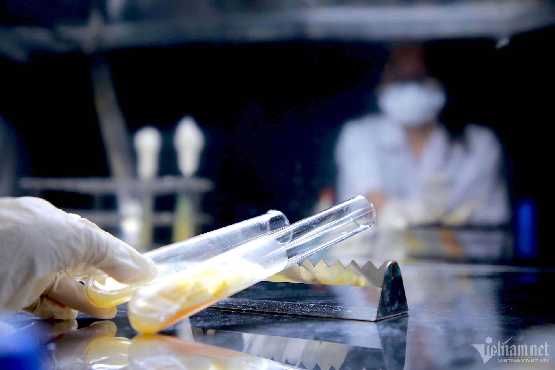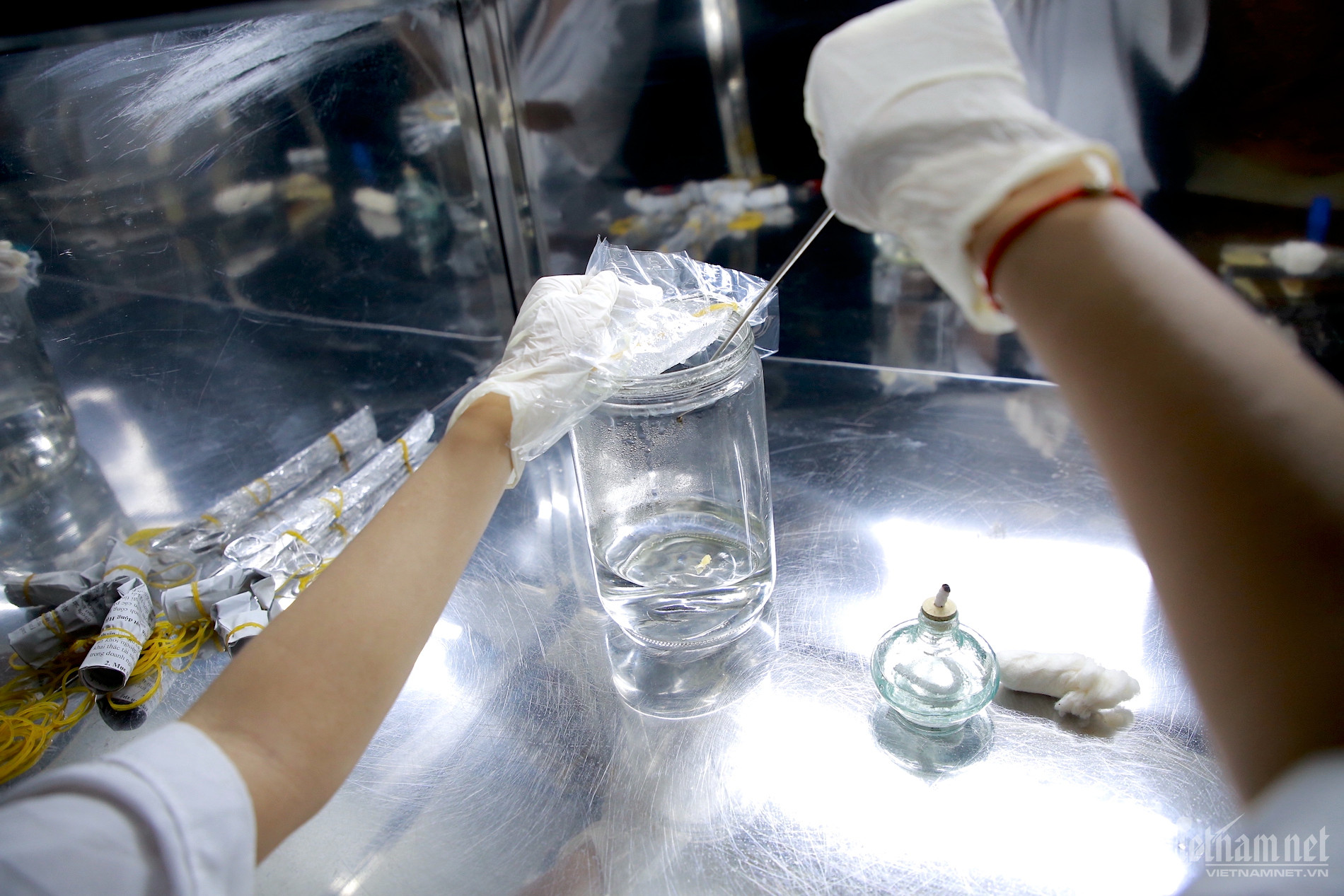 Chị Thủy đang tỉ mẩn chuẩn bị ống nghiệm, bên trong chứa mảnh bông cùng dung dịch đặc sệt. Sau khi đun qua lửa, chị gắp một phần nhỏ cho vào lọ dung dịch lớn, cẩn thận đậy lại. Đây là những công đoạn đầu tiên trong quy trình sản xuất đông trùng hạ thảo của người phụ nữ năm nay mới bước sang tuổi 31.