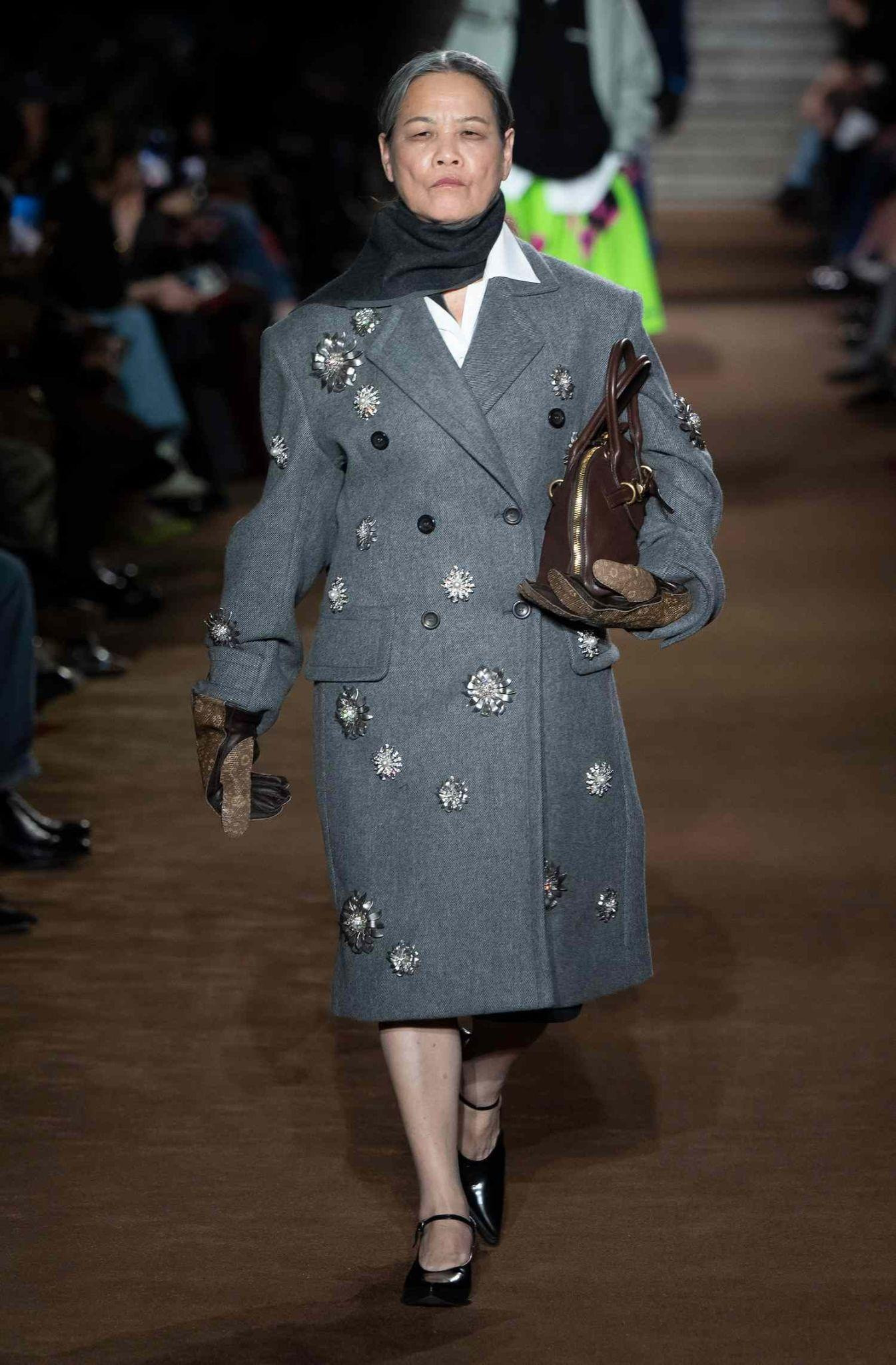 Nữ người mẫu gây chú ý đó là bà Qin Huilan (70 tuổi, đến từ Trung Quốc) - khách hàng thân thiết của thương hiệu Miu Miu và Prada. Thực tế, bà Qin từng được biết đến trước khi xuất hiện trên sàn diễn của Miu Miu nhờ những bức hình thời trang con trai bà đăng tải trên mạng xã hội.