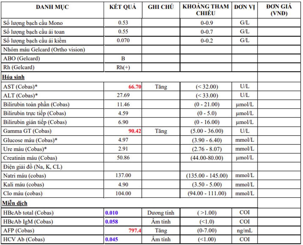 Chị P.T.T. (36 tuổi, trú tại Hà Nội) đến một bệnh viện ở Hà Nội khám vì đau âm ỉ, tức bụng suốt 3 tuần. Kết quả xét nghiệm cho thấy, chỉ số Gamma GT tăng cao: 90.42 U/L (bình thường 5.00-36.00 U/L), chỉ số AFP tăng cao: 797,4 ng/mL (bình thường 0-7,00 ng/mL). Đây là marker có giá trị chẩn đoán, theo dõi điều trị ung thư gan.