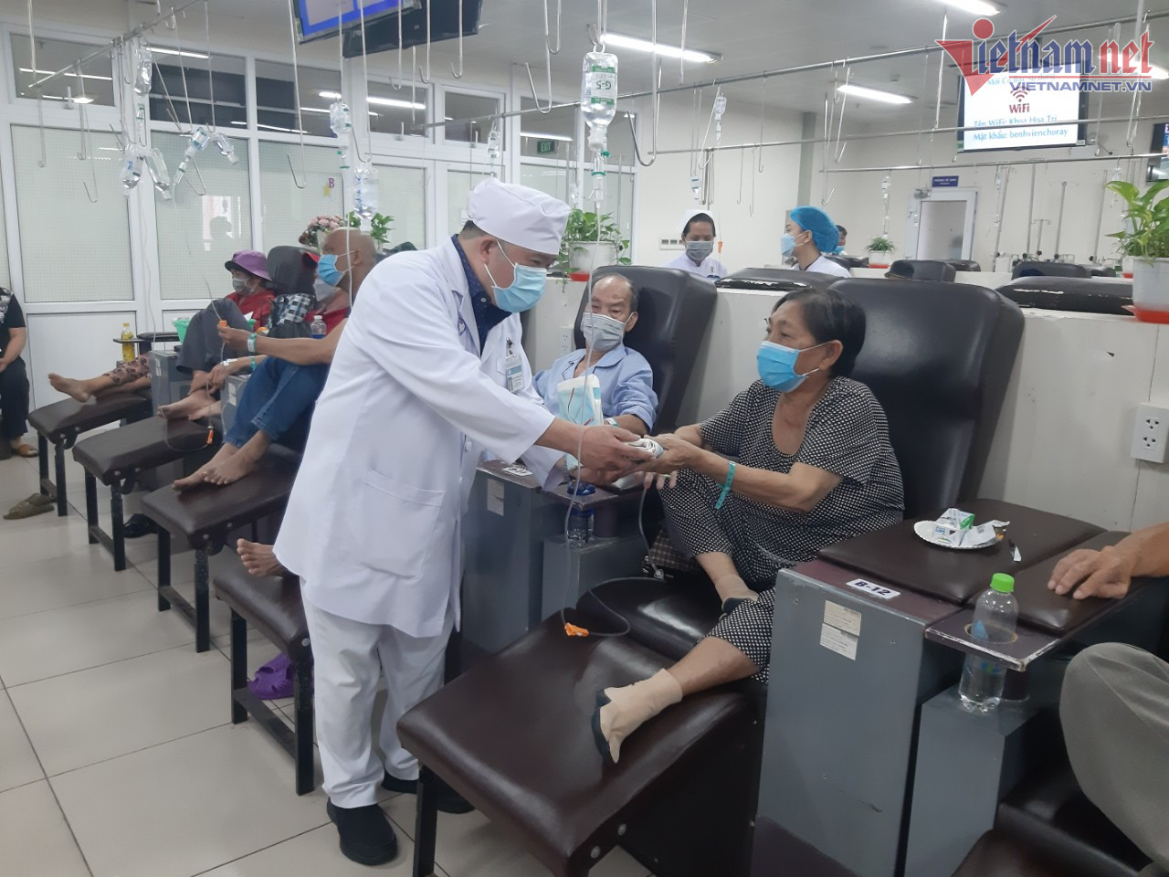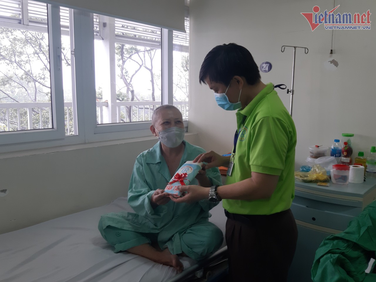 Nhiều bệnh nhân đang truyền thuốc hóa chất tại Khoa Hóa trị và bệnh nhân bị ung thư vú đang chờ phẫu thuật vô cùng bất ngờ. Ngoài những đôi mắt cong cong nụ cười, còn có những giọt nước mắt vì ngỡ ngàng, hạnh phúc.