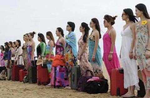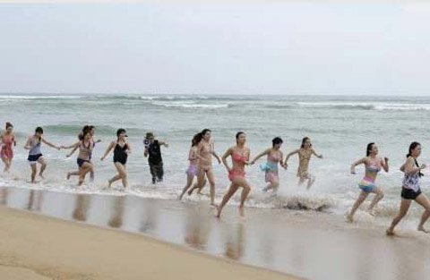 | Các nữ vệ sĩ tương lai đứng thành hàng trên bãi biển trước khi bài tập bắt đầu |