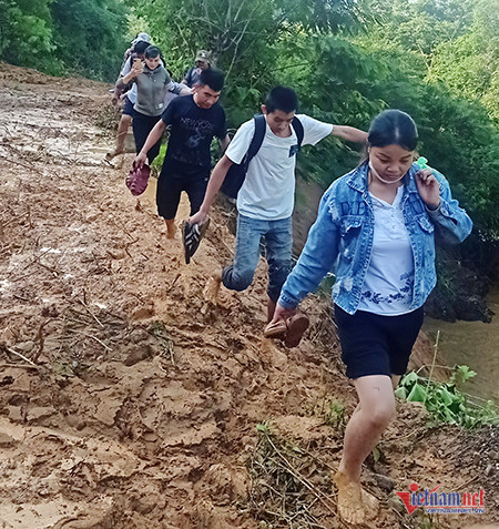 Để đảm bảo an toàn, các giáo viên phải đi theo từng tốp hỗ trợ nhau. Tại những điểm sạt lở, họ phải men theo con đường nhỏ cheo leo nằm sát sườn núi, bên dưới là vực sâu hun hút.