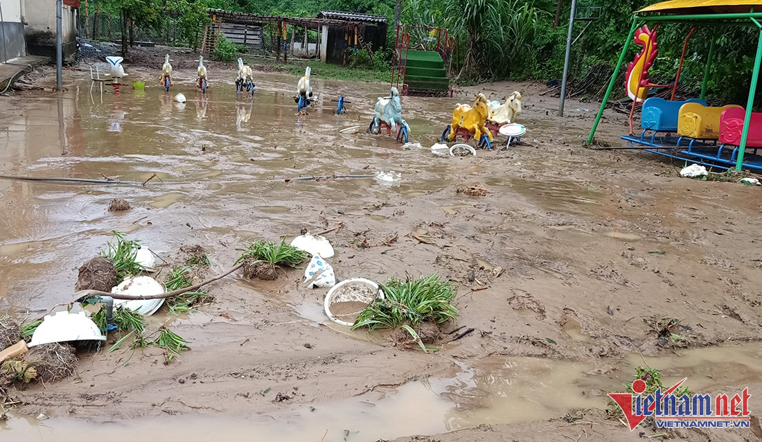 Mưa lũ đã làm sập 50m bờ rào tường xây, 90m bờ rào thép B40, cuốn trôi và làm hư hỏng hệ thống đồ dùng dạy học, đồ chơi của các cháu.