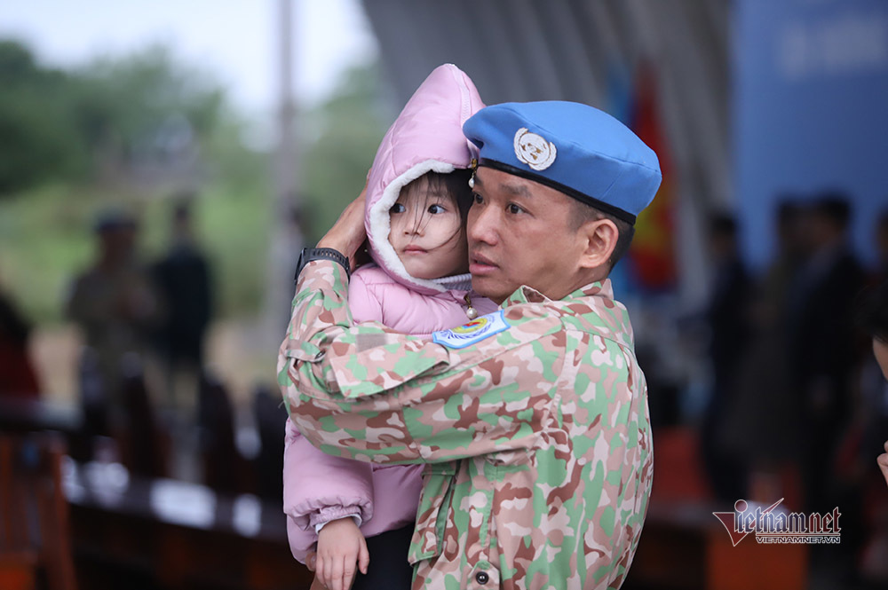 Nép vào lòng mẹ là bé Bún, con gái đầu lòng của Đại úy Lê Hồng Vân và Đại úy Lê Hồng Thanh. Hôm nay bé ra sân bay tiễn bố lên đường làm nhiệm vụ, một tuần sau bé cũng sẽ chào từ biệt mẹ. Đây là cặp vợ chồng bác sĩ Việt đầu tiên tham gia gìn giữ hòa bình đợt này.