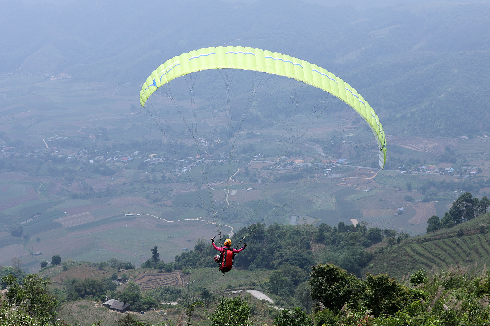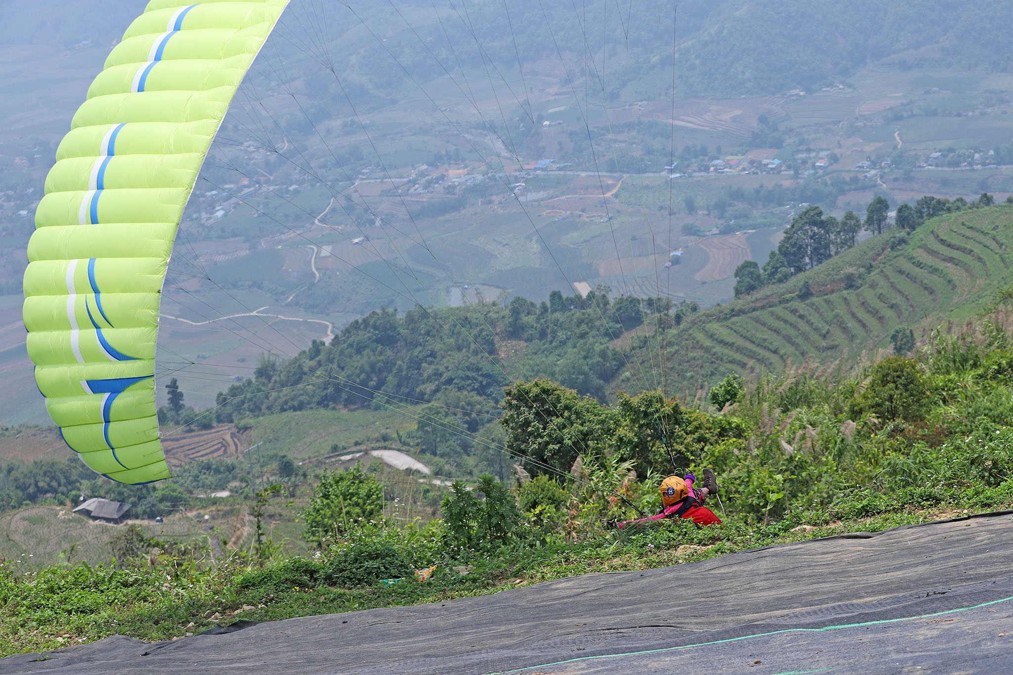 Sáng 14/4, chị Cao Vĩnh Thịnh (Hà Nội) có mặt tại bản Sì Thâu Chải, xã Hồ Thầu, huyện Tam Đường, tỉnh Lai Châu để chuẩn bị cho chuyến bay dù lượn ở độ cao khoảng 800m.