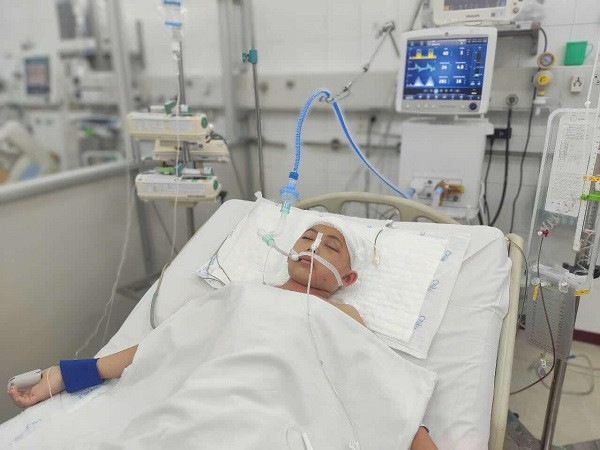 Tại đây, bác sĩ xác định Kiều bị chấn thương sọ não hố sau, xuất huyết dưới nhện lều tiểu não, giãn não thất, chảy máu não. Hiện em đã được phẫu thuật dẫn lưu não thất ra ngoài. Do tình trạng khá nặng, em cần điều trị dài ngày.